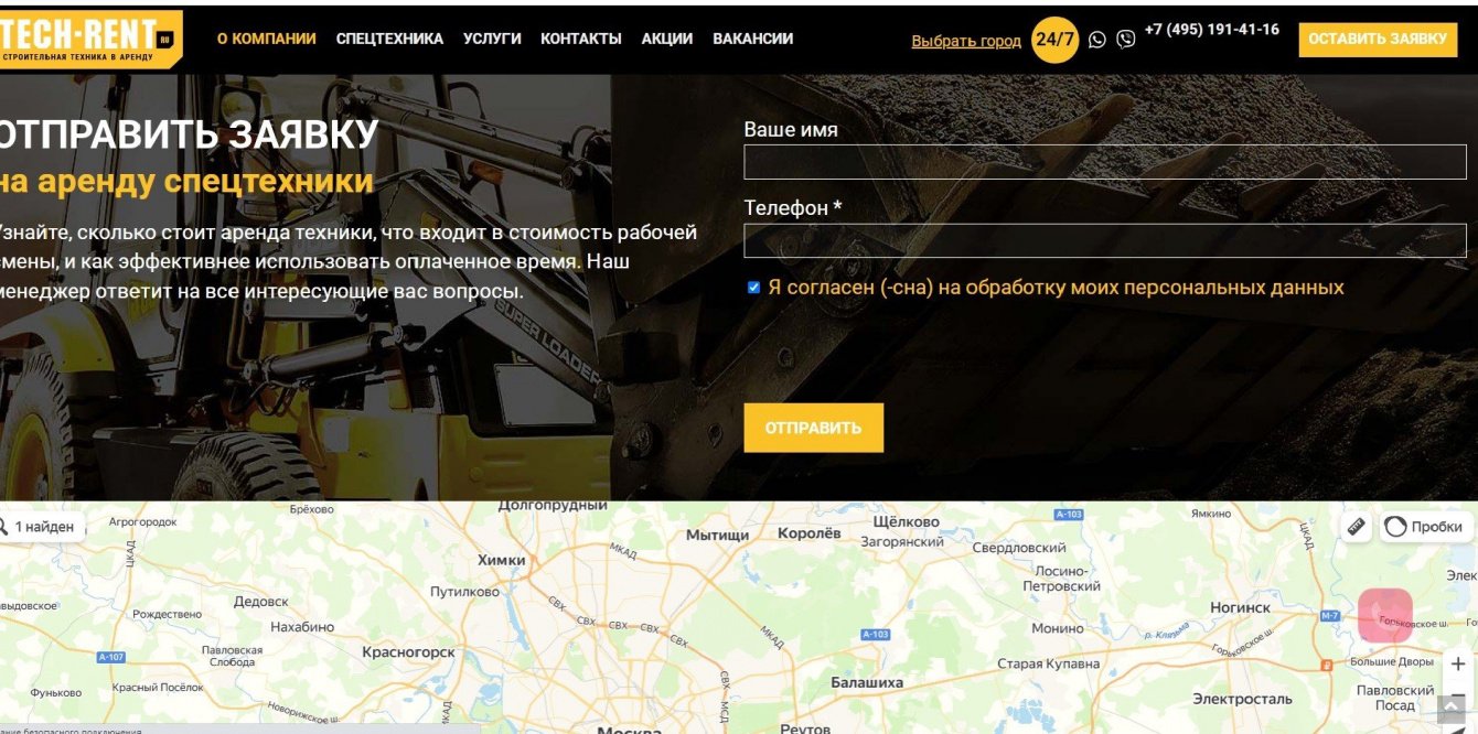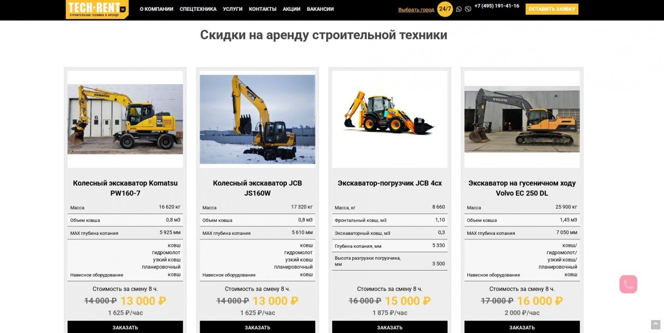 Наш заказчик — компания TECH-RENT, предоставляющая в аренду спецтехнику для проведения строительных, дорожных и земляных работ, транспортировки грузов, благоустройства территории. Среди услуг TECH-RENT как долгосрочная аренда, так и предоставление спецтехники для выполнения разовых работ на выгодных условиях. В автопарке компании есть: