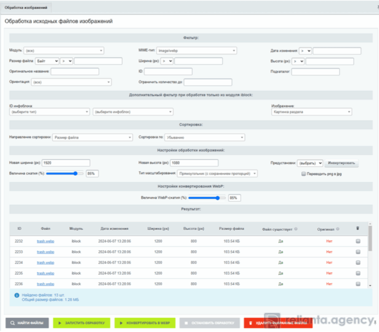 - Все изображения были конвертированы в выбранные форматы с помощью инструментов командной строки (cwebp для WebP) Битрикса.