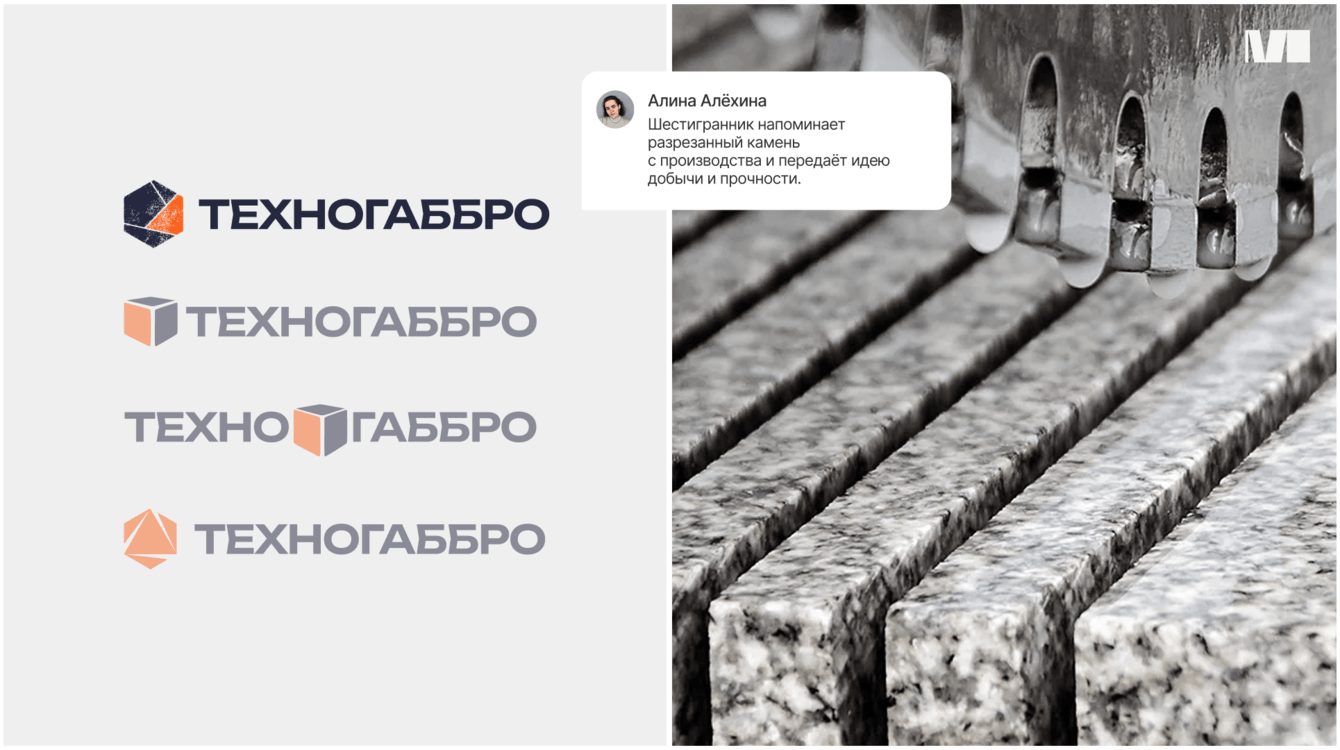 Было несколько вариантов форм. Треугольник — интересно, куб — интересно, но как будто отсылает к детской тематике. В итоге оставили разрезанный камень, шестигранник, как у нас есть на фотографиях с производства. Хотелось в логотипе показать и структуру камня — габбро-диабаза, она немного шершавая.