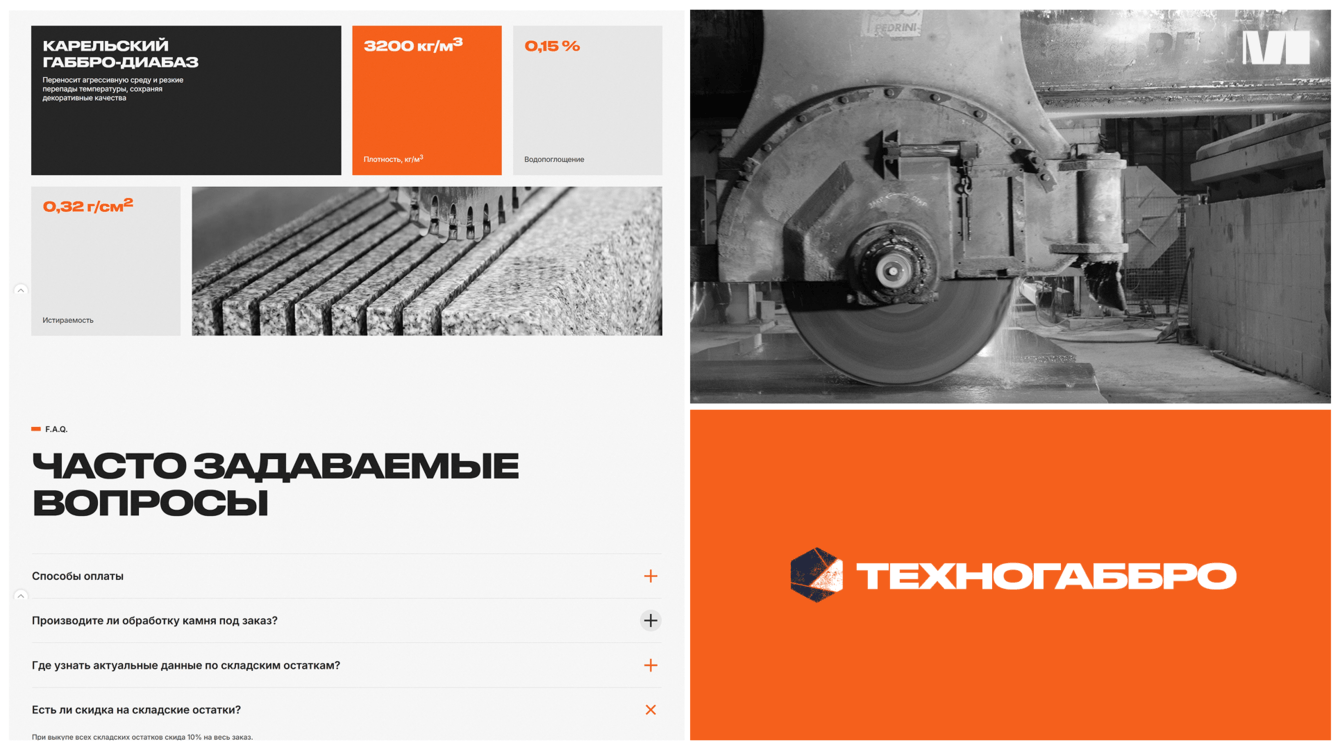 Во второй раз пришли к бело-оранжевым цветам. Белый фон выбрали, потому что «Техногаббро» — коммерческий сайт и нужно, чтобы пользователь мог легко считывать информацию, с темного фона это делать сложнее.
