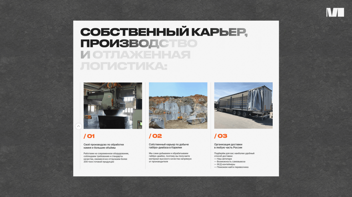— благодаря контенту от заказчика, добавили некий сторителлинг на сайт. Фотографии на сайте показывают реальные этапы работ: есть месторождения камней, вид в распиленном состоянии, когда этот камень увозят на производство, есть фотографии, где плиты уже распилены в разные форматы, отполированы и готовы к продаже;
