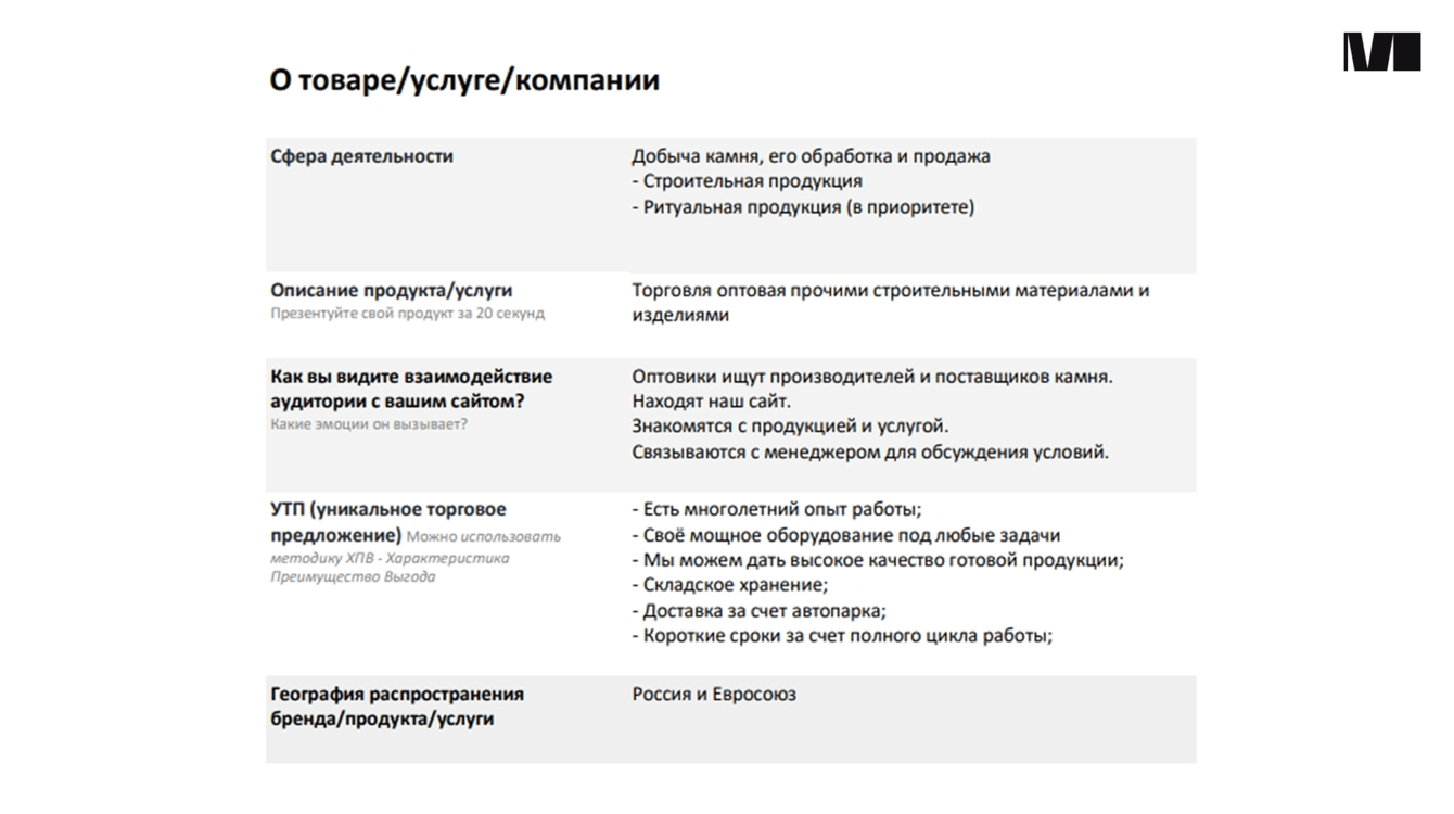 На брифинге выяснили, что целевая аудитория сайта — оптовые закупщики камня в России и СНГ. Они закупают камень у таких производителей, как «Техногаббро», и затем могут его перепродавать или дорабатывать на более маломощном оборудовании.