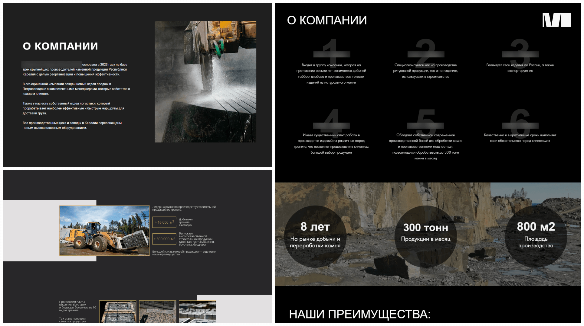 — благодаря контенту от заказчика, добавили некий сторителлинг на сайт. Фотографии на сайте показывают реальные этапы работ: есть месторождения камней, вид в распиленном состоянии, когда этот камень увозят на производство, есть фотографии, где плиты уже распилены в разные форматы, отполированы и готовы к продаже;