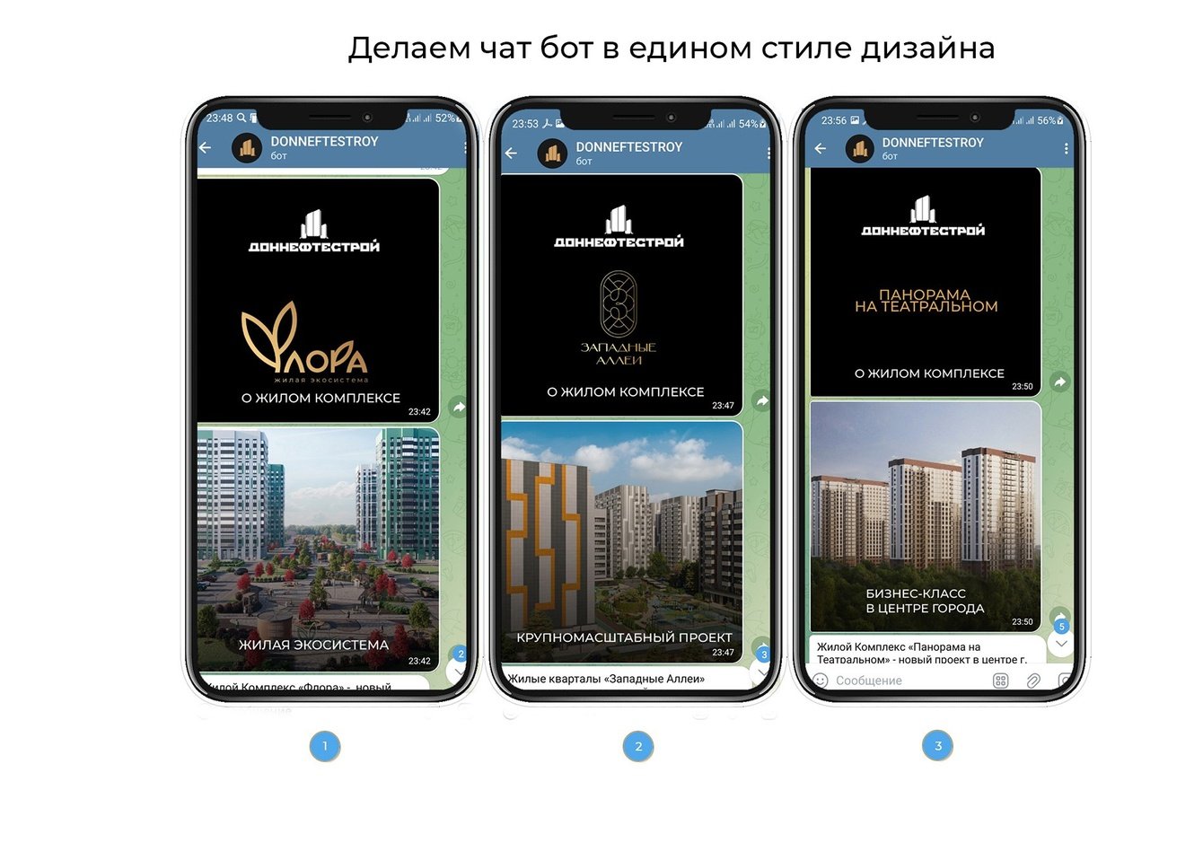 Создан и работает чат-бот в Телеграм. С 5-ю независимыми входами в чат-бот (в каждый ЖК и ветку Застройщика) при условии запуска рекламы, а также с единым входом с сайта Заказчика.