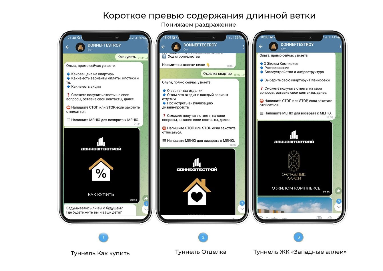 На старте проекта была гипотеза, что надо сделать цепочку сообщений по каждому ЖК, где была бы вся информация по объекту (расположение, инфраструктура, планировки и т.д.), включая варианты оплаты, информирование о ходе строительства.