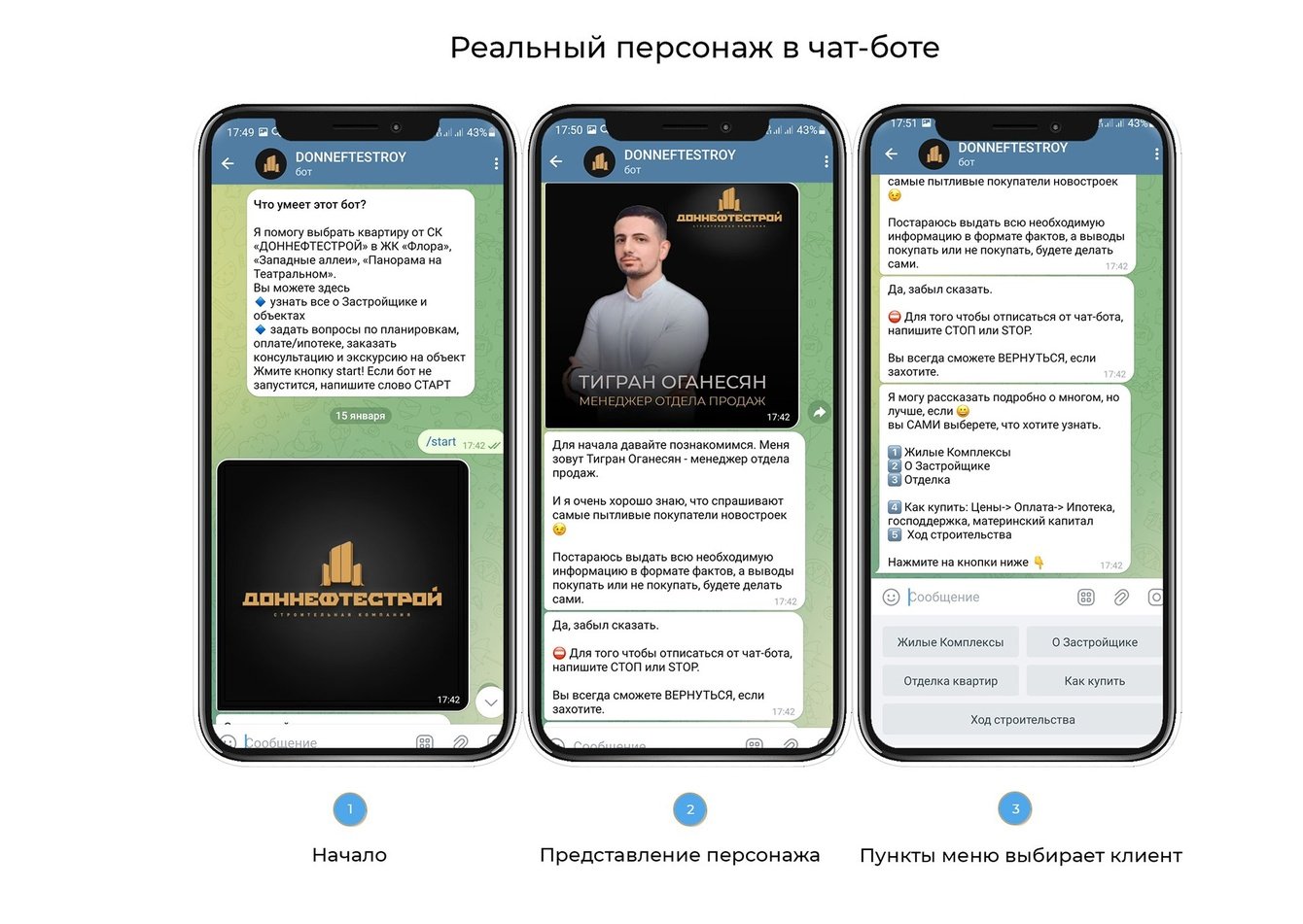 Наше агентство выбрало главного персонажа – ведущего менеджера продаж (он был активно задействован на сайте Застройщика). Все сообщения были написаны от имени очень обаятельного и ненавязчивого героя, акцентирующего внимание только на интересах потенциальных клиентов. Выводы клиент должен был делать сам. При желании клиент мог оставить свои контакты в определенных местах чат-бота. И это было причиной жестоко баттла внутри команды разработчиков.