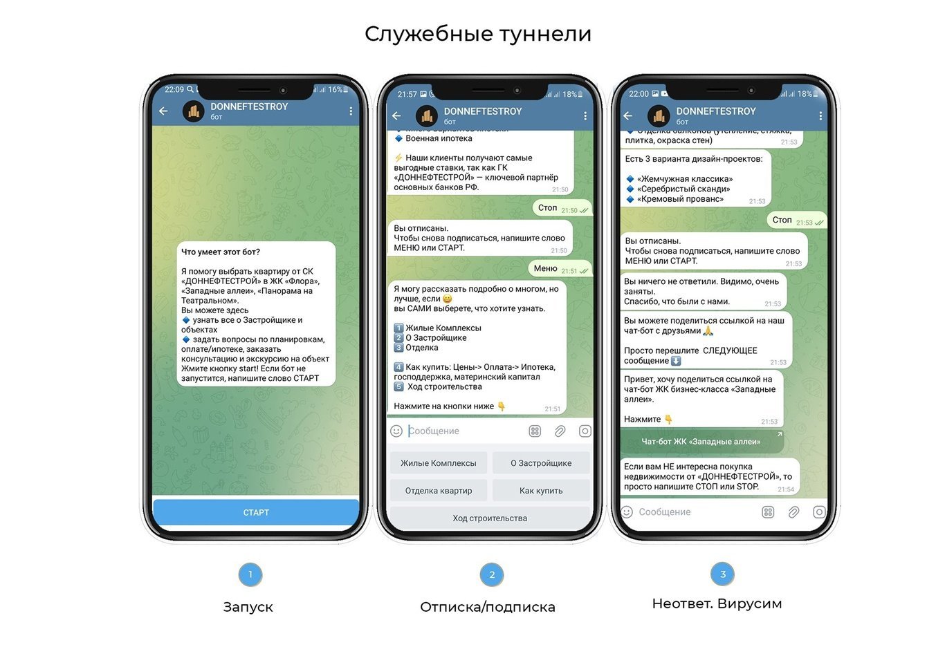 Такой подход был основан на успешном нашем предыдущем опыте создания чат-бота по продаже коттеджей в поселке бизнес-класса «Донской». Цепочки по ЖК решили собрать в единую систему информирования о всех объектах Застройщика.