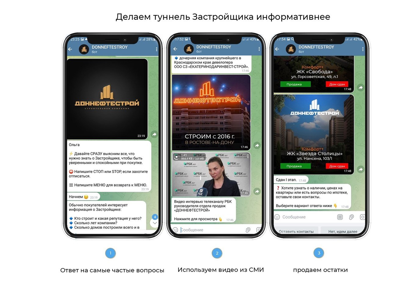 Планировалось выдавать информацию в режиме пассивного диалога чат-бота с клиентом, где клиент выбирал ЖК и далее получал последовательно все сообщения, взаимодействуя только в точках сбора контактов, если на то было желание у клиента.