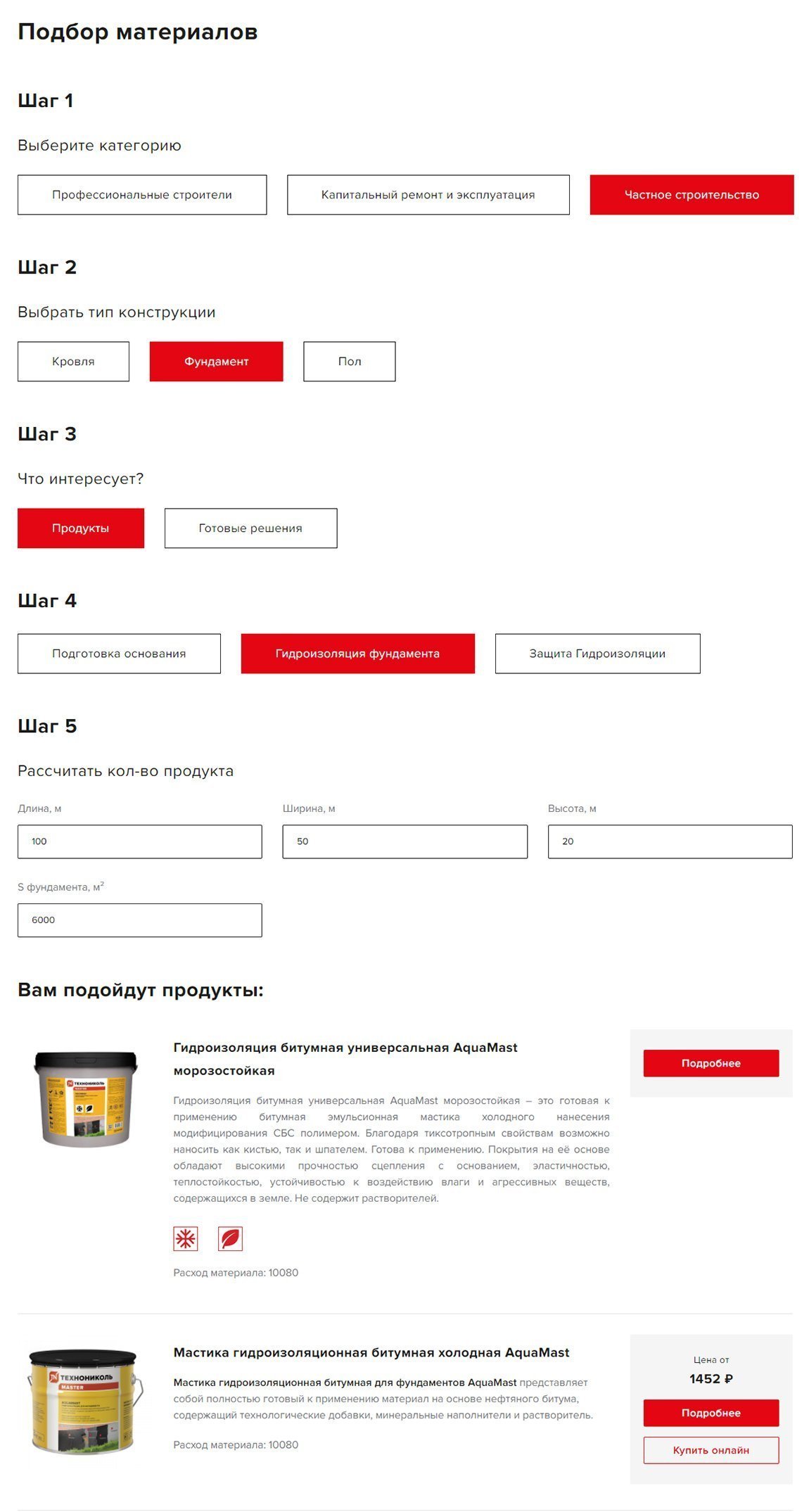 Разработали интерактивный подборщик продукции. Система задает вопросы, пользователь отвечая на них, получает подборку товаров. Также в помощник встроено 7 калькуляторов для разных категорий продукции, помогающих понять, сколько товара необходимо приобрести при строительных работах.