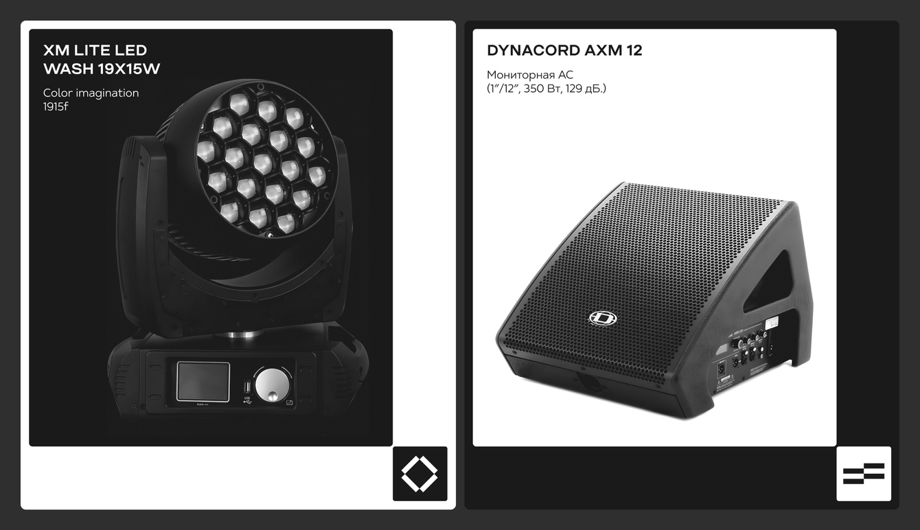 На втором этапе мы сфокусировались на практическом применении брендинга. Ключевой особенностью проекта стала проработка носителей с учетом специфики оборудования клиента. Мы спроектировали макеты, которые органично смотрятся на аппаратуре, кофрах, элементах сцен и сценических конструкциях. Универсальность созданной системы позволяет бренду выглядеть целостно и профессионально независимо от габаритов и фактуры носителя, превращая каждый элемент технического парка в эффективный рекламный носитель.