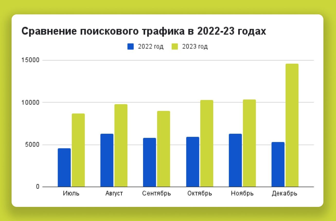 Если сравнить трафик в 2023 и 2022 годах, когда работы по оптимизации еще не велись, то можно увидеть значительный рост трафика из всех поисковиков. На графике видно, что в декабре 2023 года трафик вырос в 3 раза, относительно показателей прошлого предыдущего года.