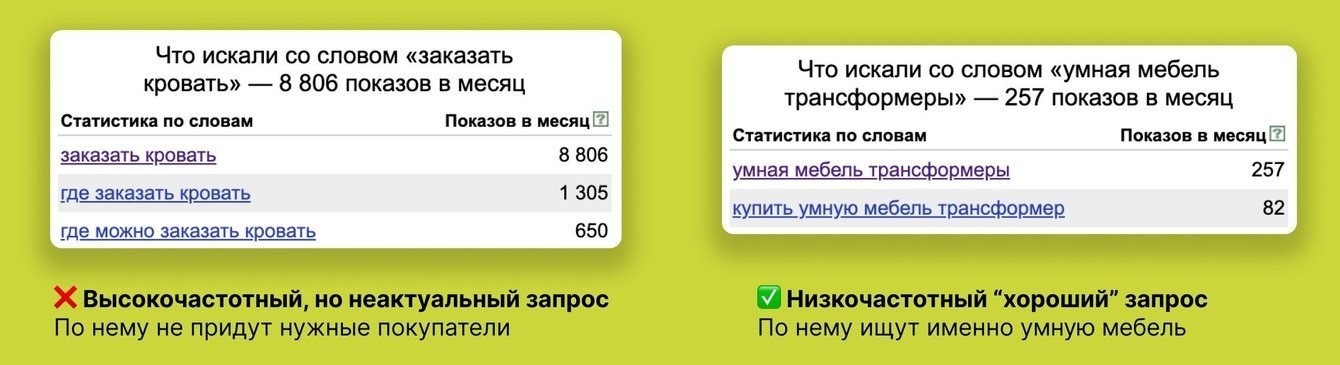 Например, запрос «заказать кровать» вбивают в «Яндекс» 8,8 тыс. раз в месяц. А запрос «умная мебель трансформеры» — всего 257 раз. Зато это именно те две сотни человек, которые интересны производителю мебели.