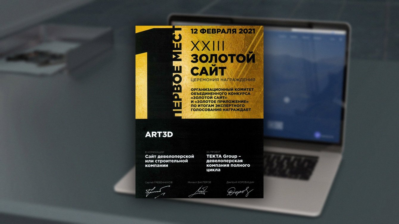 Успех проект не заставил себя долго ждать: 12 февраля 2021 г. состоялась традиционная церемония объявления победителей ключевого и старейшего конкурса интернет-проектов в Рунете — «Золотой сайт». Лучшим сайтом девелоперской или строительной компании признан корпоративный сайт Tekta Group, созданный в 2020 году командой ART3D.