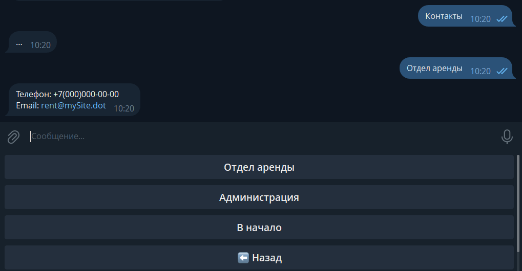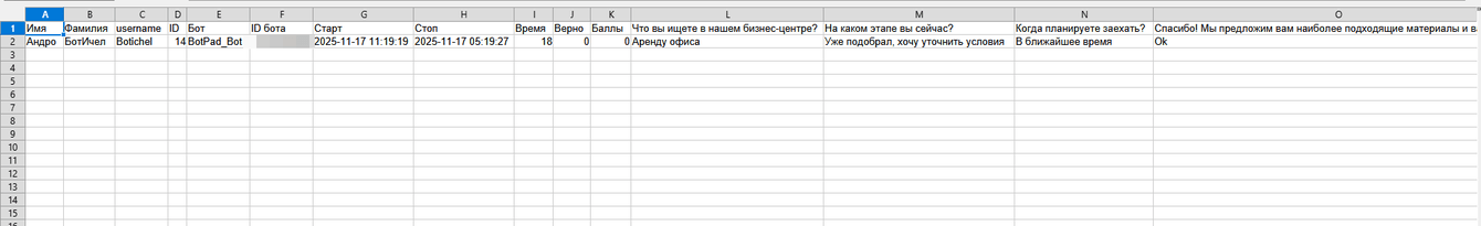 Благодаря этому менеджеры оперативно получают полные контактные данные и важные параметры запроса, а ответы пользователей уже распределены по сегментам. Это значительно сокращает время реакции на заявки и позволяет проводить точечные рассылки по конкретным группам (например, только тем, кто ищет офис до 30 м²). Весь сценарий можно быстро доработать под свои условия: менять тексты, добавлять медиа, прикреплять файлы, скрывать или показывать разделы отдельным сегментам.