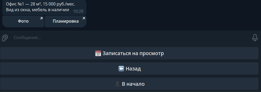 На выходе пользователь сценария получает готовую систему взаимодействия с потенциальными арендаторами: структурированное меню с актуальной информацией о помещениях, автоматические квизы для записи на просмотр или подачи заявки на подбор, и сегментацию аудитории по целям и срокам въезда. Все собранные данные фиксируются в удобной форме — их можно смотреть в панели конструктора или отправлять в интеграции (CRM, Google Sheets, Telegram-группы).