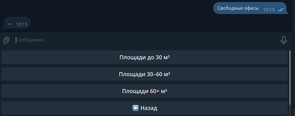 Цель — упростить процесс первичного общения, сделать получение информации о доступных помещениях интерактивным и структурированным, ускорить реакцию менеджеров на заявки и обеспечить удобный канал коммуникации для клиентов.