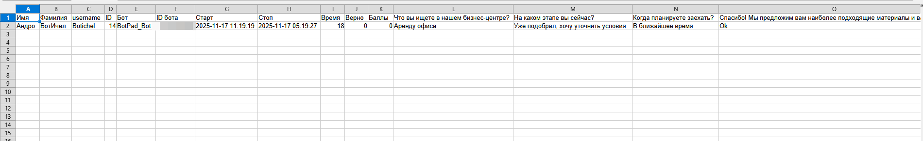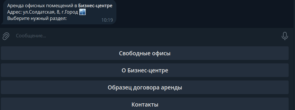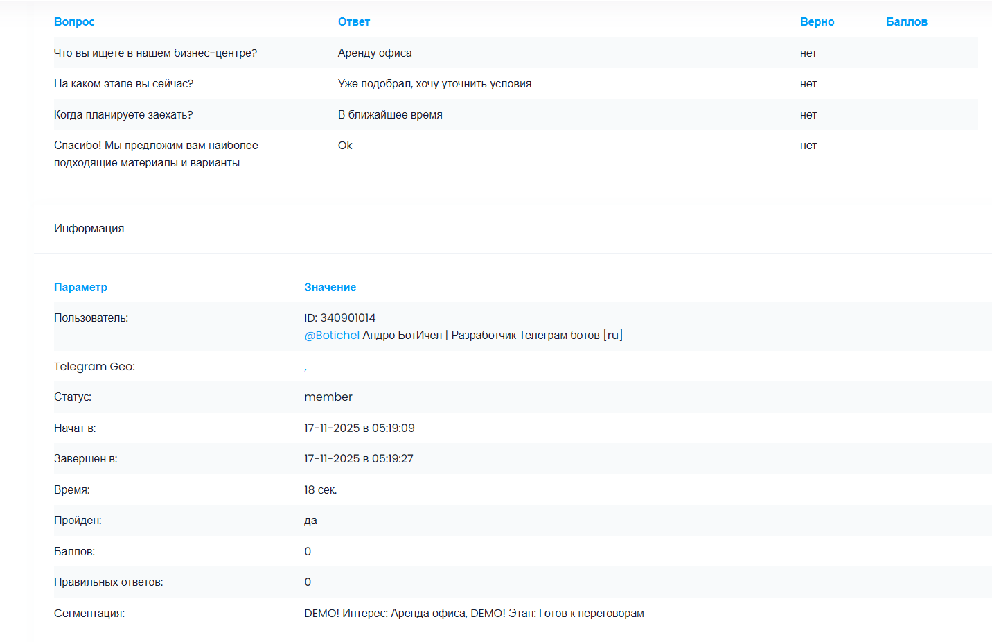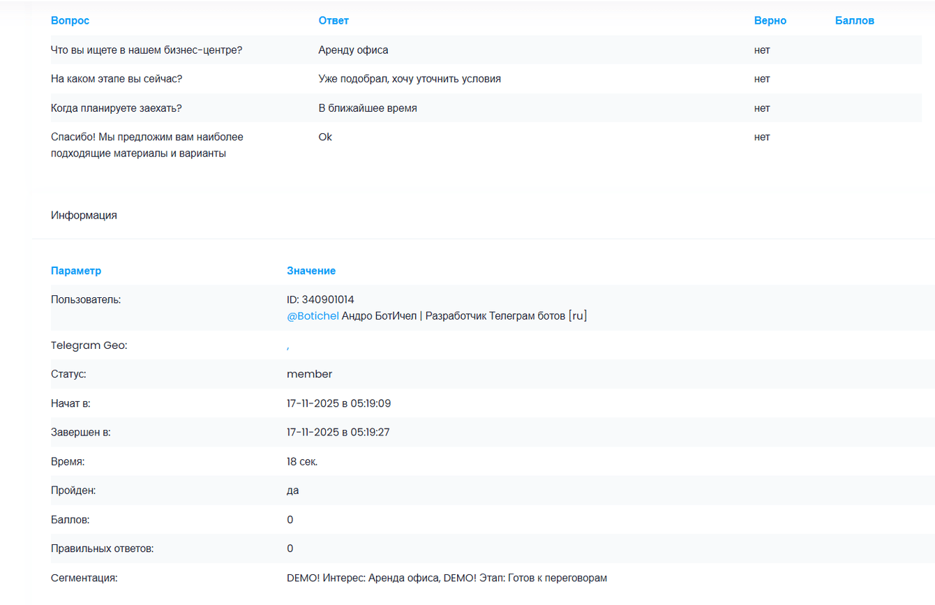 На выходе пользователь сценария получает готовую систему взаимодействия с потенциальными арендаторами: структурированное меню с актуальной информацией о помещениях, автоматические квизы для записи на просмотр или подачи заявки на подбор, и сегментацию аудитории по целям и срокам въезда. Все собранные данные фиксируются в удобной форме — их можно смотреть в панели конструктора или отправлять в интеграции (CRM, Google Sheets, Telegram-группы).