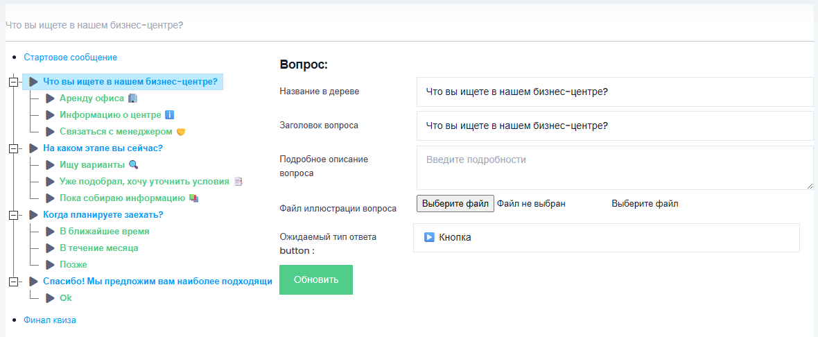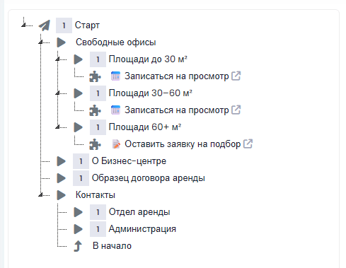 Сценарий построен так, что все переходы между уровнями понятны и не требуют дополнительного пояснения: кнопки ведут либо к вложенным разделам, либо запускают опросы. При необходимости в конструкторе можно добавить медиа — фотографии, видео, 3D‑тур по помещениям — и адаптировать тексты под конкретный бизнес-центр.