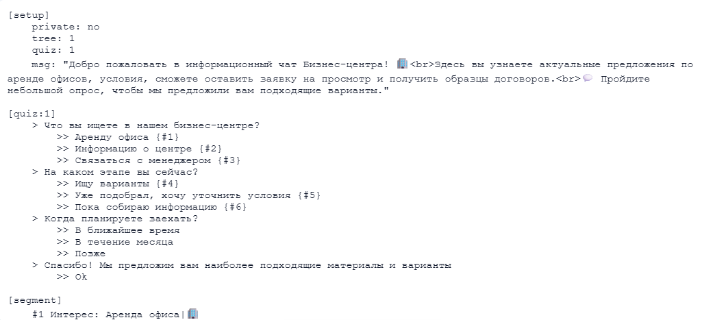 Создать сценарий Telegram-бота для бизнес-центра, который позволит потенциальным арендаторам быстро находить актуальные предложения по офисам, получать дополнительные материалы и оставлять заявки без звонков и переписки. Бот должен автоматически сегментировать пользователей по их интересу (аренда, общая информация, связь с менеджером), стадии принятия решения и срокам въезда, чтобы предлагать релевантный контент и предложения.