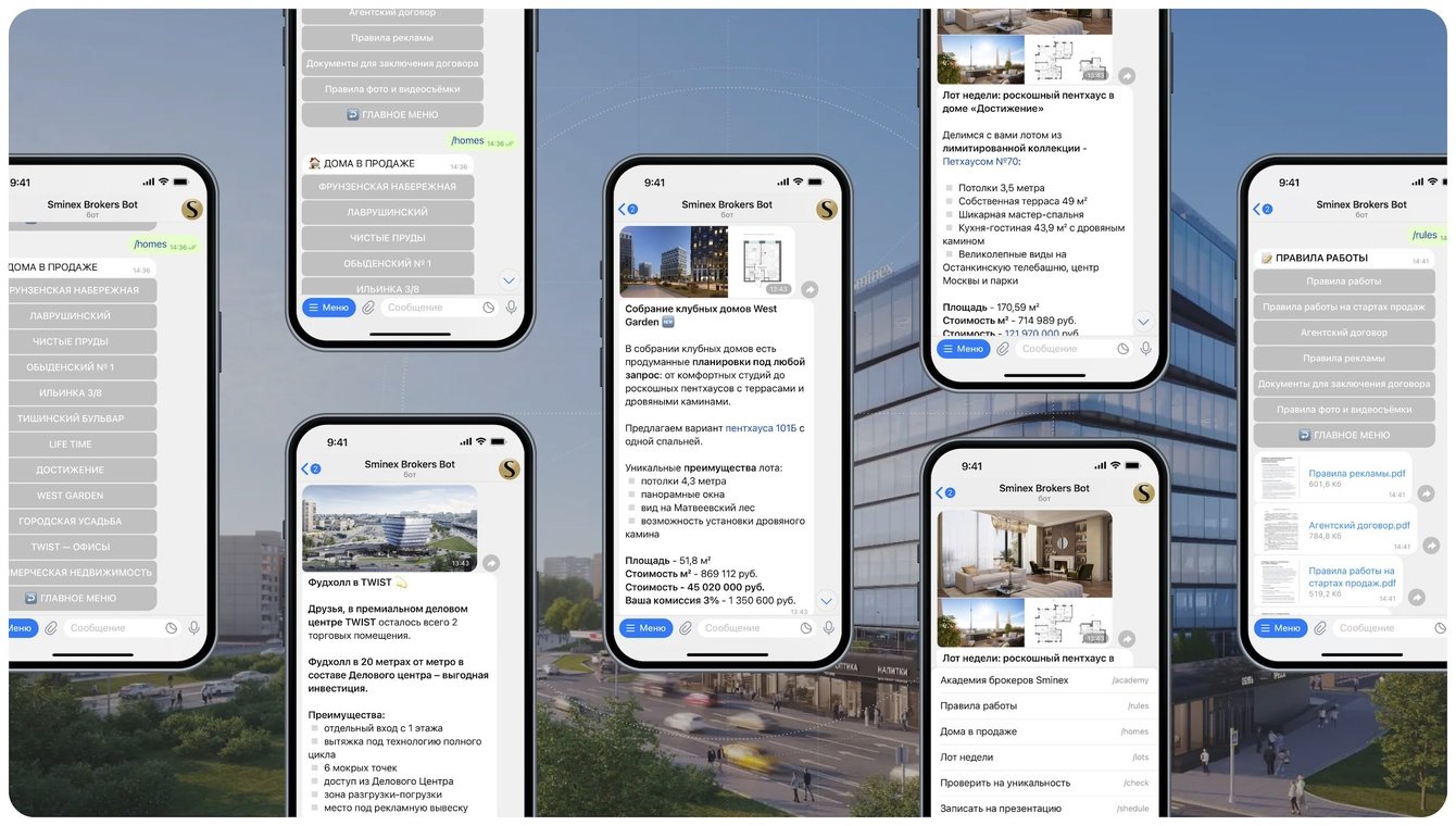 1. Нативный бот в Telegram «Sminex Brokers Bot» предоставил брокерам ключевую информацию о проектах Sminex и объединил их в одном пространстве. Для администрирования контента использовали площадку BotHelp, но адаптировали ее под задачи клиента. Благодаря этому бот удобен не только для брокеров, но и для команды Sminex: изменение данных в нем занимает минуты контент-менеджера вместо стандартных часов разработчиков, что сильно экономит время и бюджет клиента.