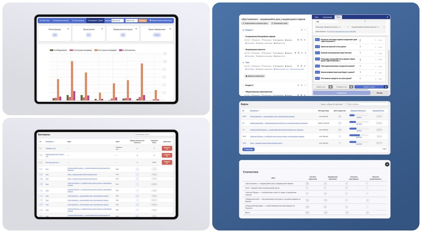 На выходе получилась полноценно работающая система с удобным управлением: можно администрировать платформу, управлять контентом курсов, отслеживать статистику взаимодействий, видеть, кто начинал обучение, сколько человек завершило курс и т.д.