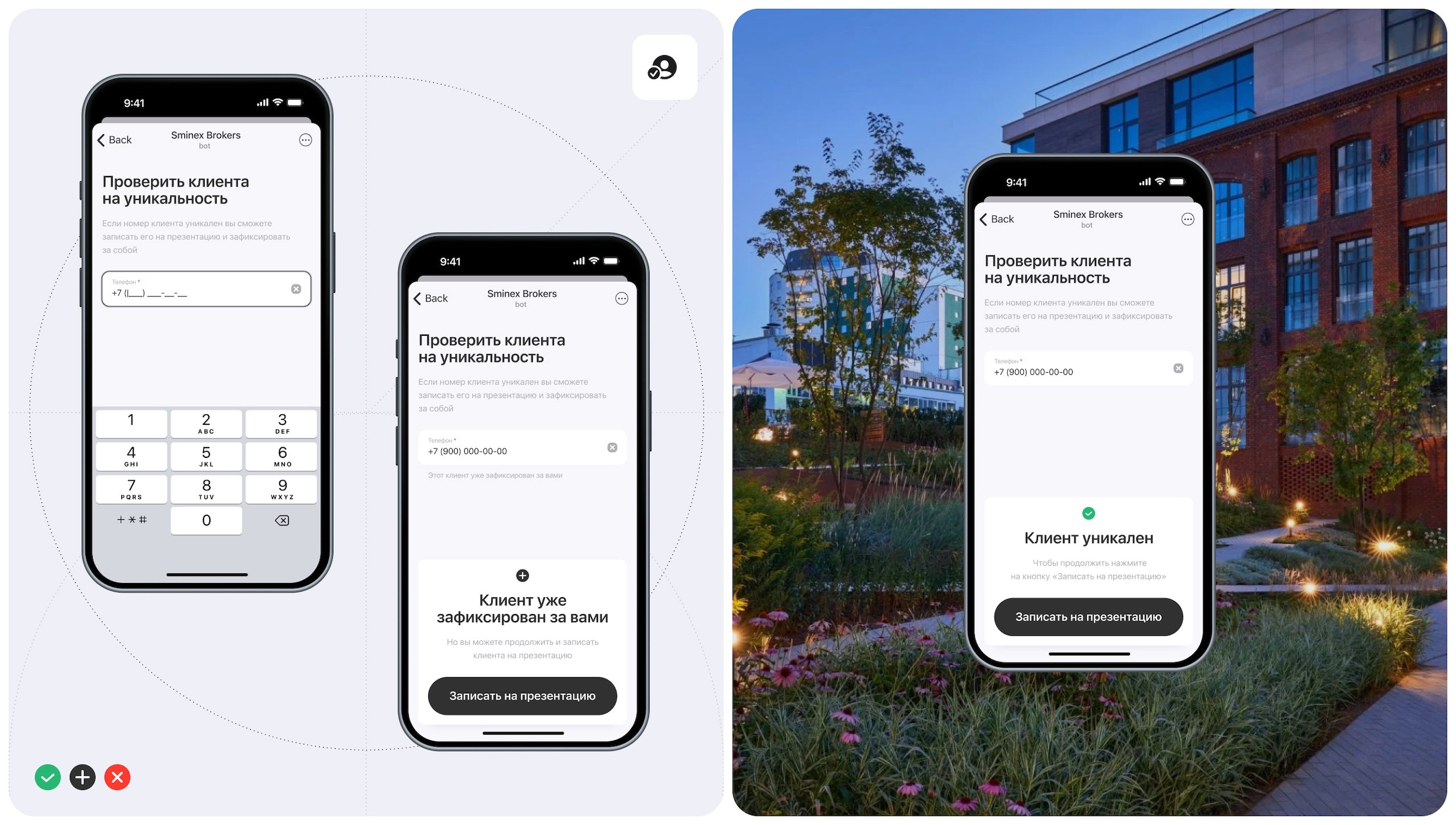 Дальше коллеги из Sminex обратились к нам с новой задачей: в рамках запущенного бота предоставить брокерам возможность проверять клиентов на уникальность (не закреплен ли номер телефона за другим брокером) и записывать их на просмотр. Было необходимо, чтобы у брокеров появился удобный инструмент для быстрого внесения клиентов и получения информации о записях.