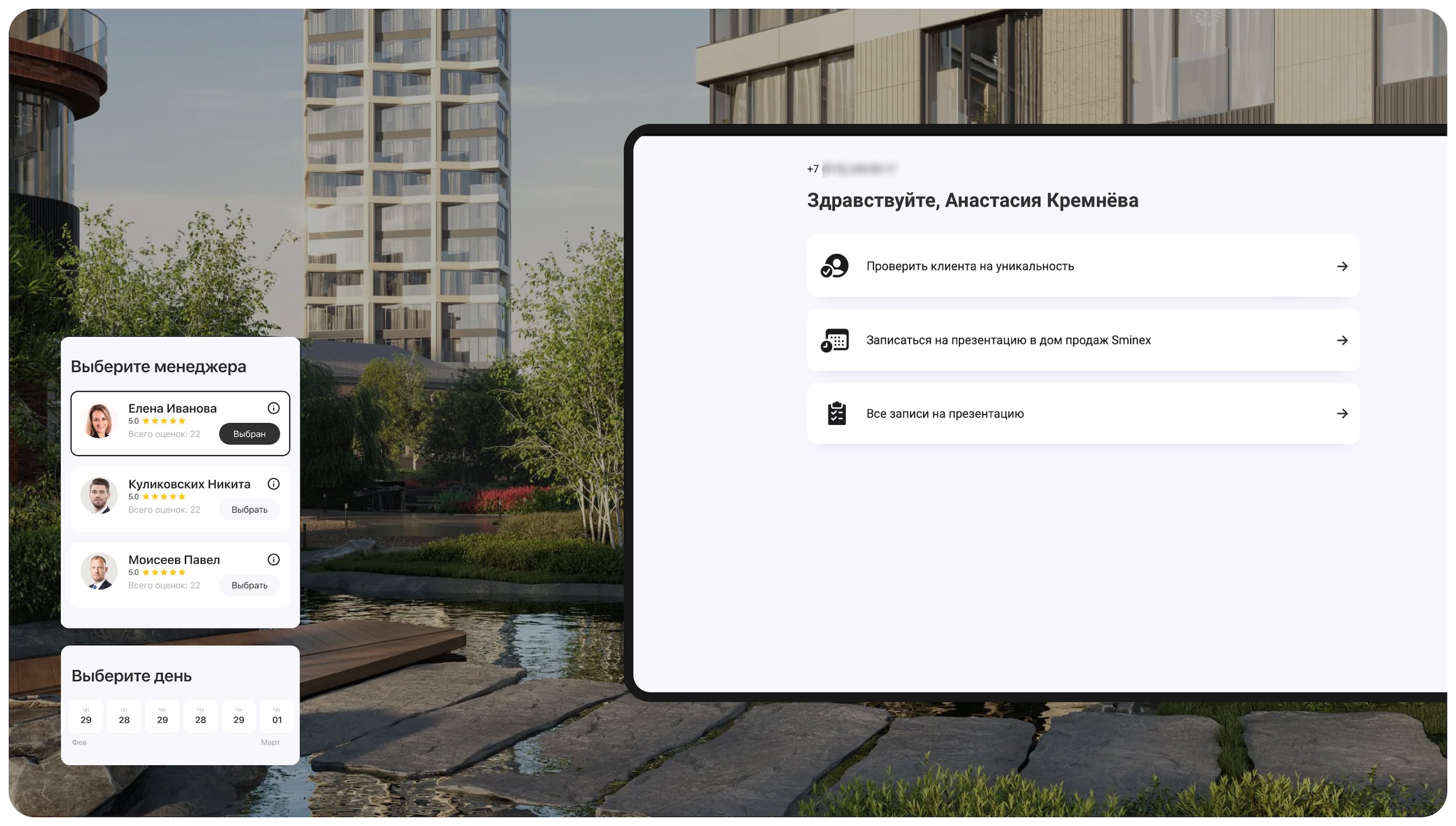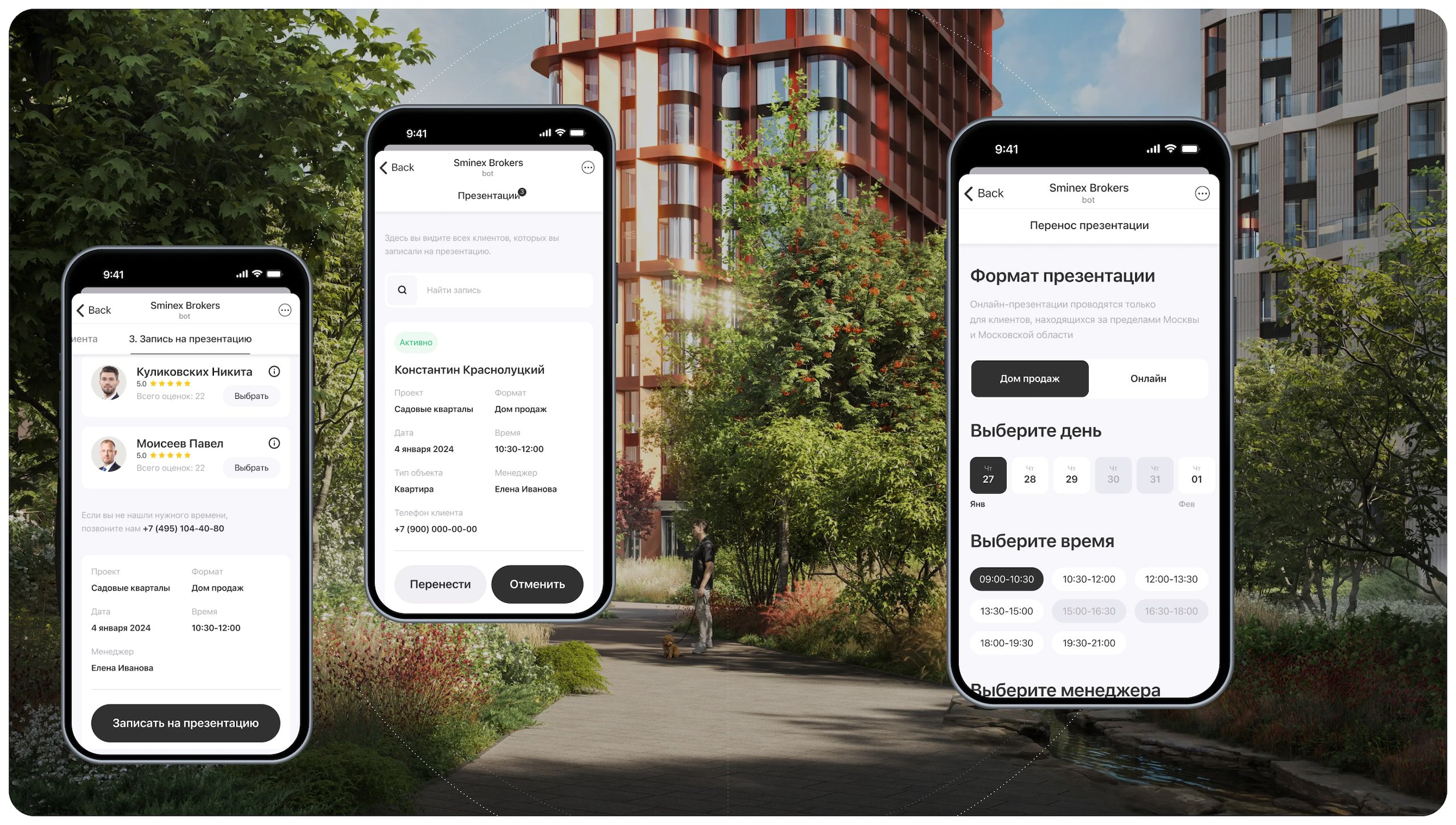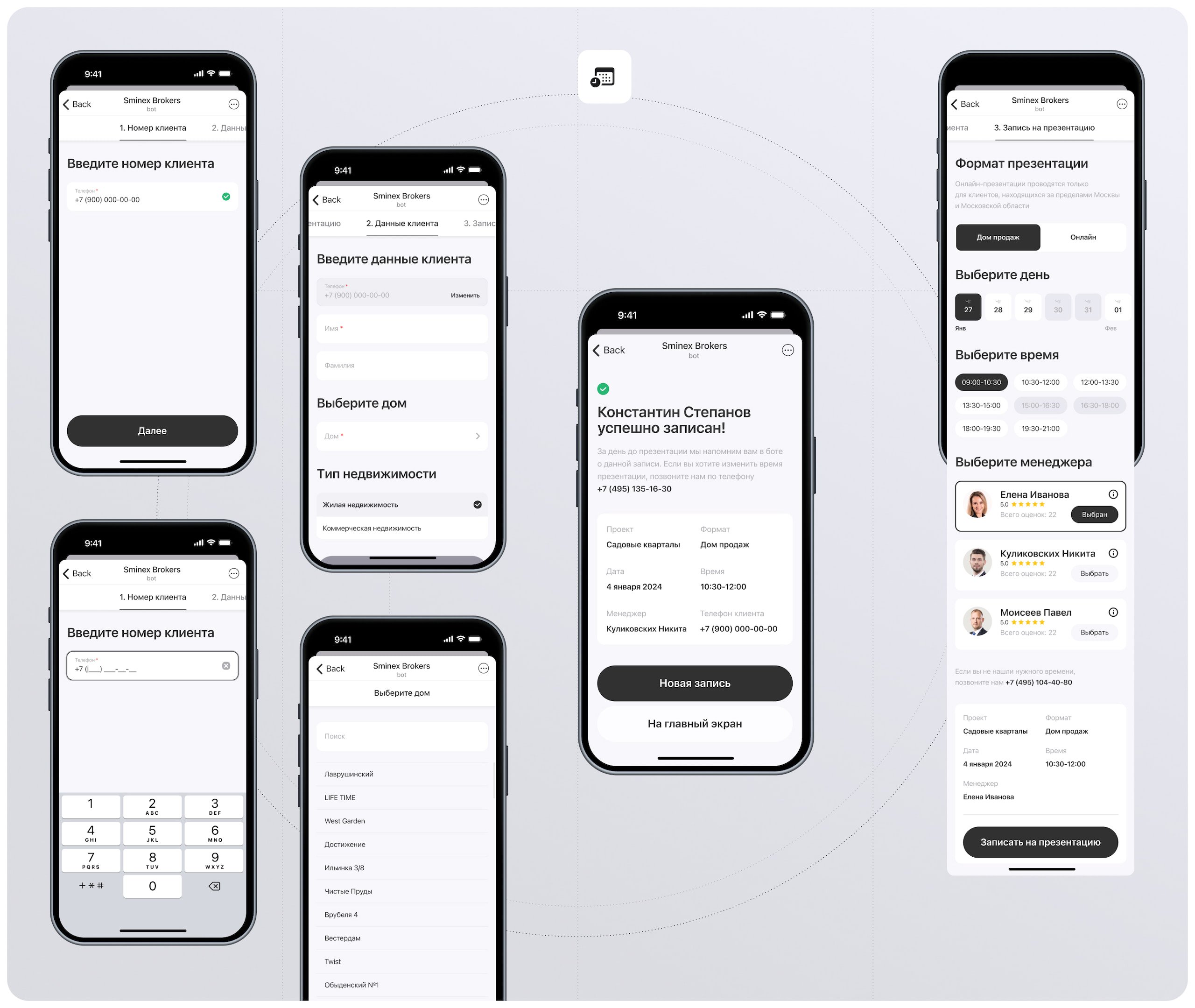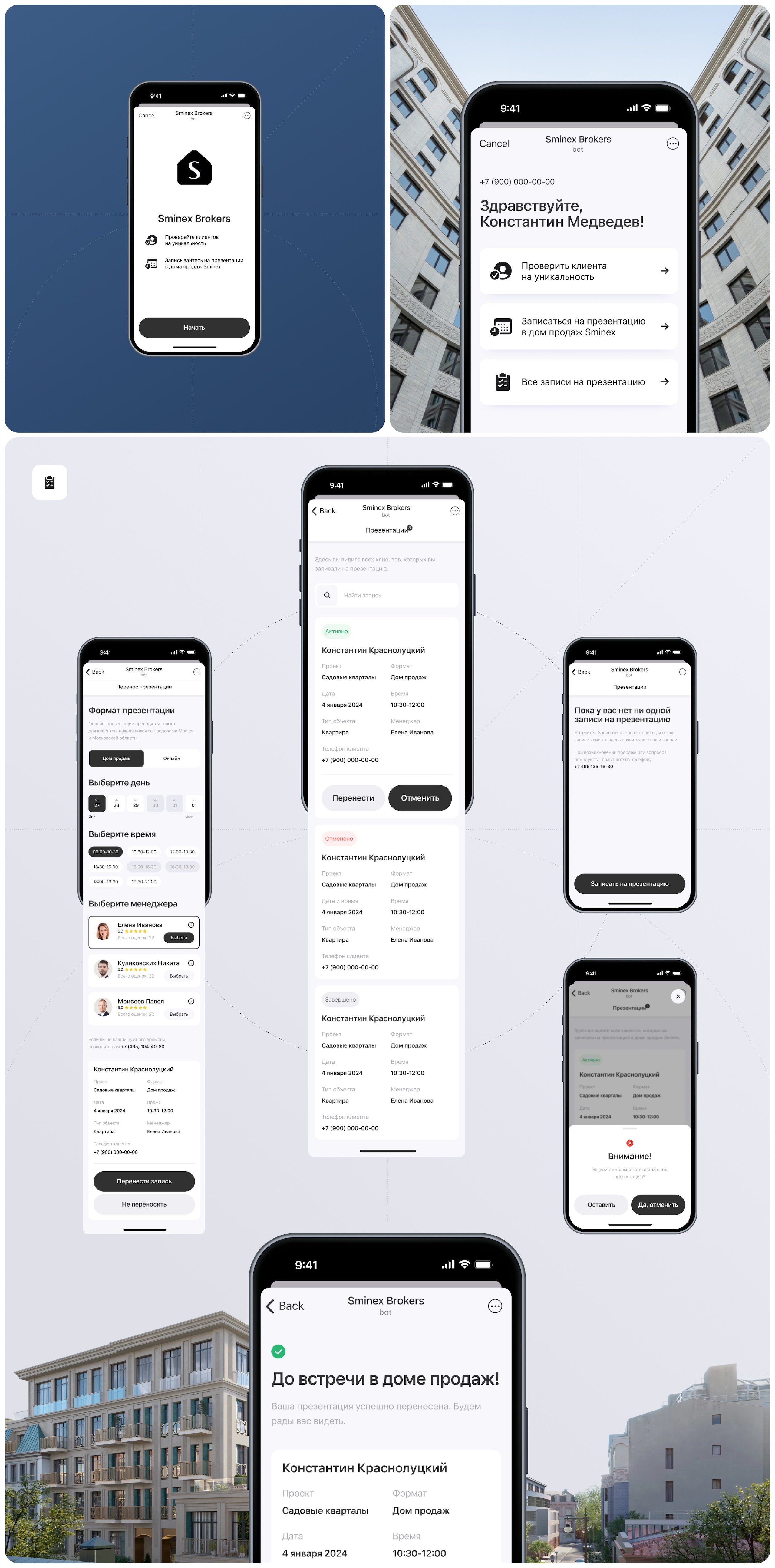 Внутри бота брокеры могут переходить в мини-приложение в рамках Telegram — здесь можно записывать клиентов на презентации, отменять и переносить записи, а также проверять, не закреплен ли клиент за другим брокером. Приложение имеет все знакомые брокерам паттерны записи клиентов на презентации — мы взяли их из личного кабинета Sminex на сайте. При этом процесс записи в приложении еще проще, особенно с телефона.
