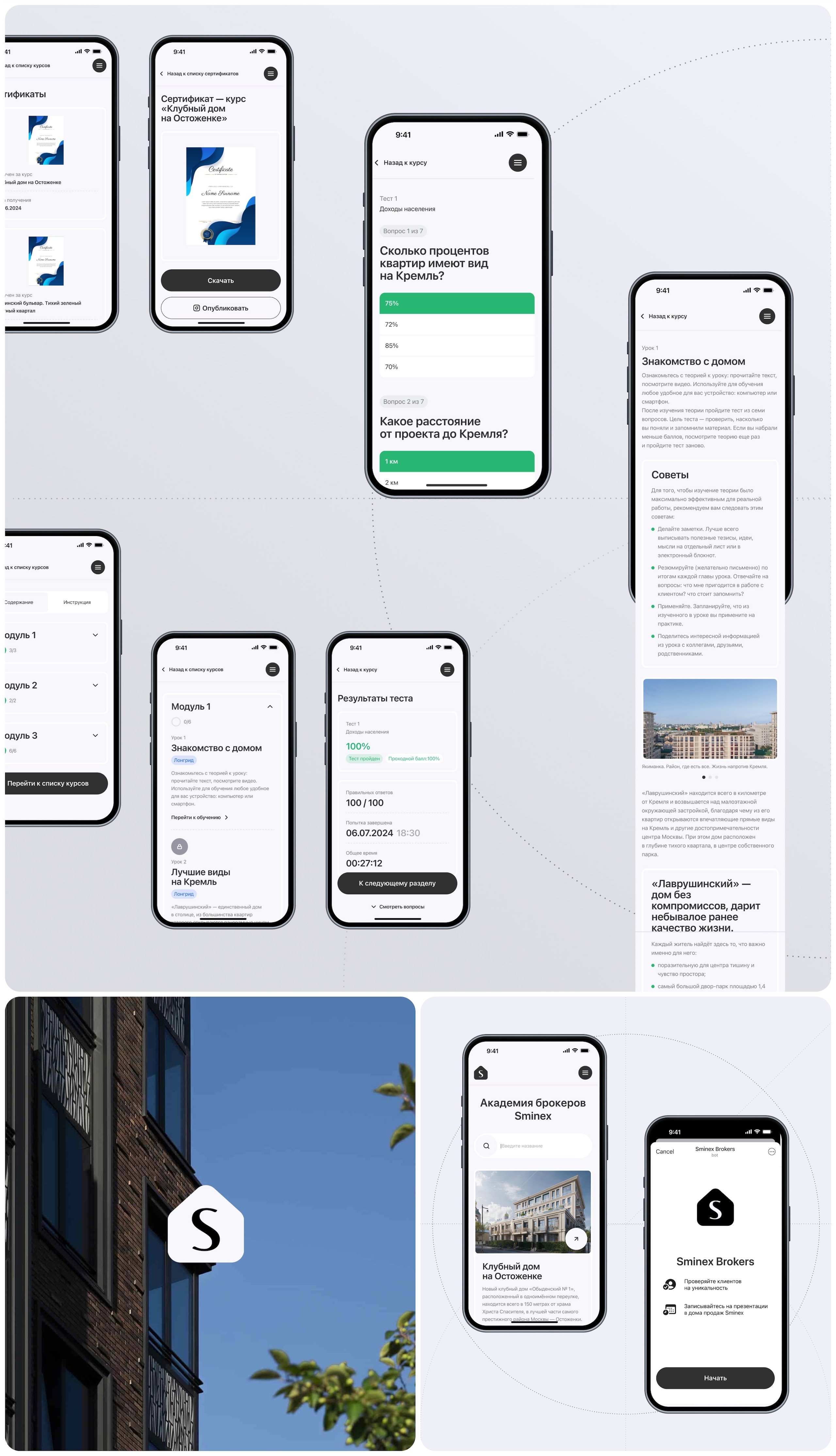 Дело в том, что Sminex решили организовать полноценное обучение брокеров по объектам недвижимости компании. Отсюда и появилась потребность во втором Mini App — он должен содержать курсы для брокеров, после которых они смогут пройти тестирование и получить сертификаты, подтверждающие их знания.