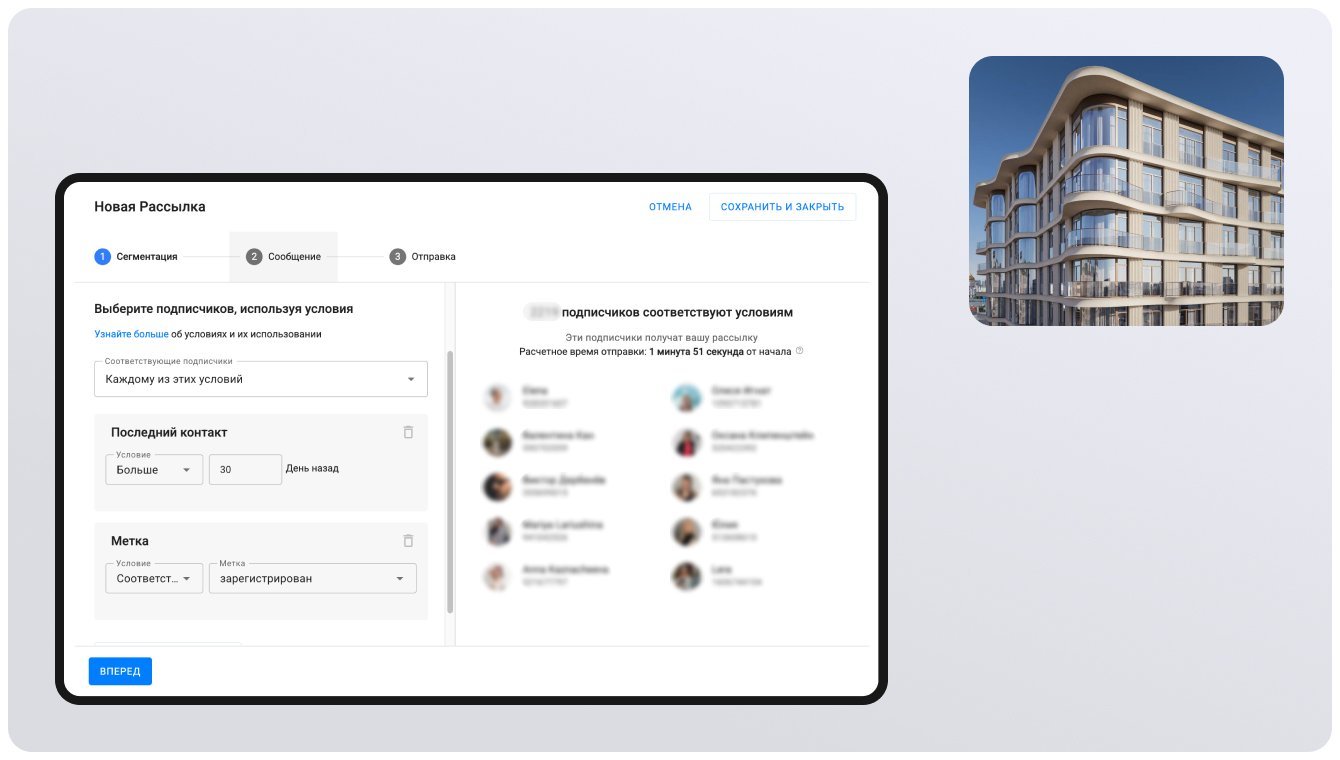Провели анализ существующих на рынке решений для сборки и управления Telegram-ботами. Остановились на платформе от BotHelp — это стабильный, удобный и проверенный нами инструмент для управления ботами. Например, он позволяет выделить нужный сегмент пользователей — допустим, тех, кто зарегистрировался в боте за последние 30 дней, — и отправить рассылку только им.