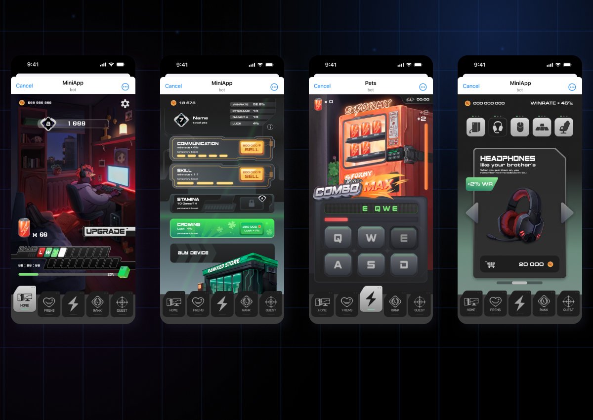Решение: игра-тапалка с соревновательной механикой. Пользователь участвует в игровых циклах и мини-играх, прокачивает персонажа, зарабатывает очки (PTS) и монеты, соревнуется в рейтингах, приглашает друзей через реферальную систему. Реализованы: валюты и ресурсы, циклы из 10–20 мини-игр с таймингами, вероятности Winrate и Luck, апгрейды, лидерборды, лутбоксы, квесты.