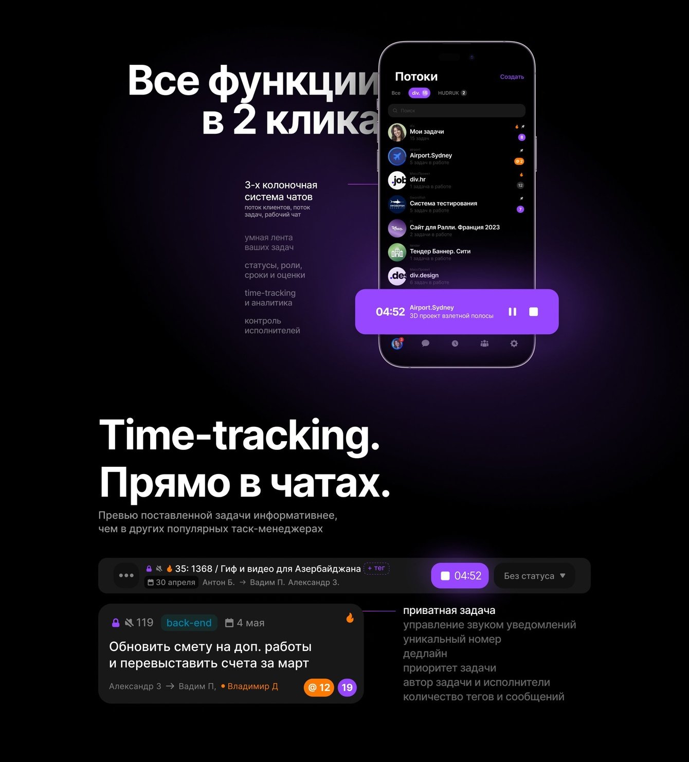 Один чат – одна задача, задачи группируются по проектам. У задач есть автор, исполнители, наблюдатели. Также есть необходимость чтобы люди фиксировали время, которое они потратили на задачу с последующей аналитикой времени по всем задачам и проектам.