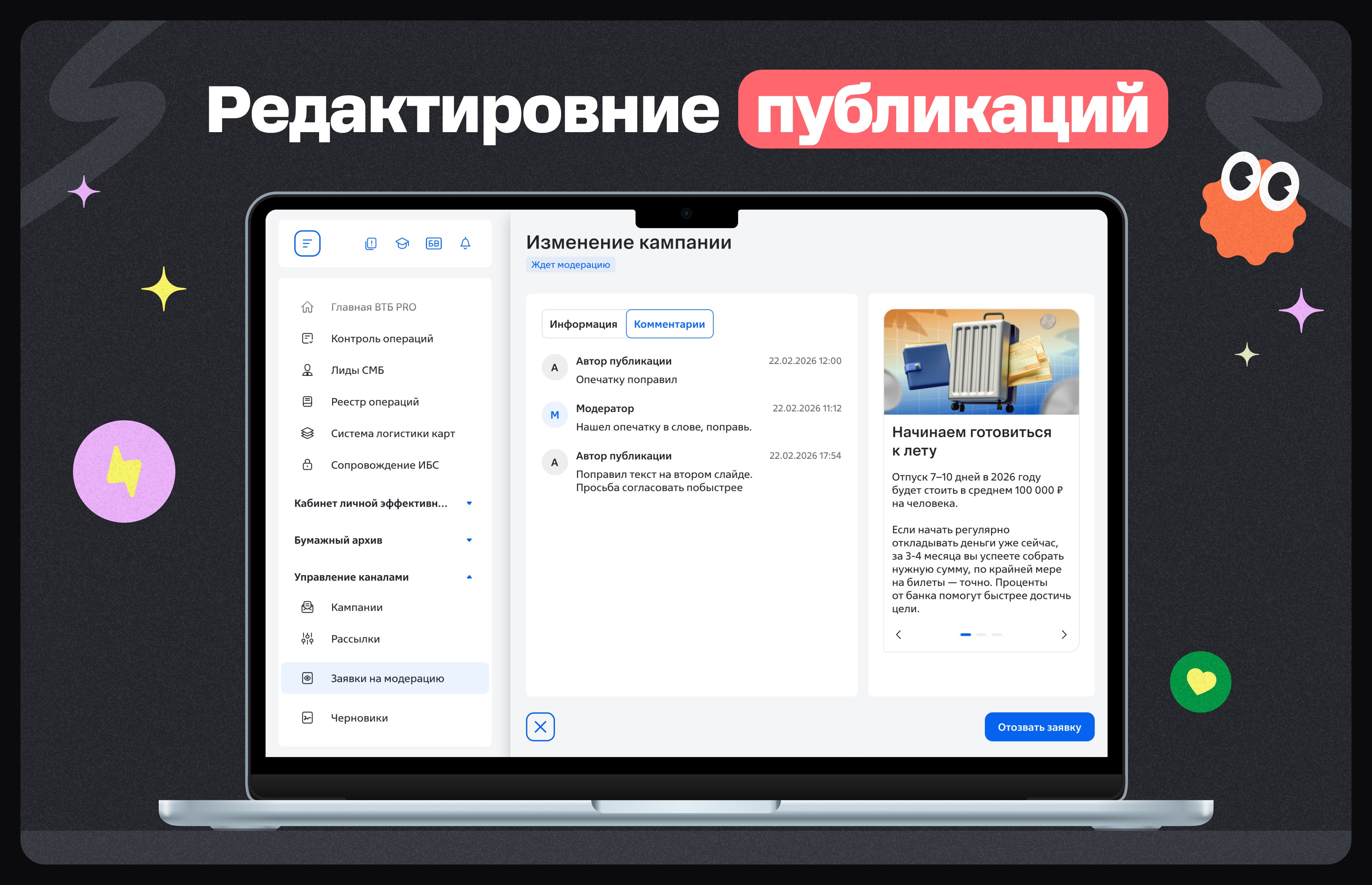 Кроме того, мы продумали функцию редактирования опубликованного поста. Это позволяет вносить правки на лету — например, актуализировать ссылки или вносить изменения при обновлении условий акций.