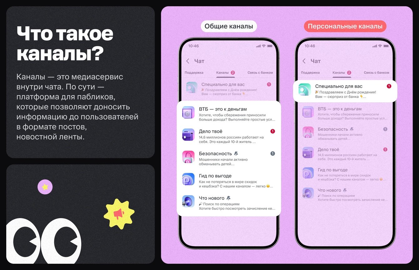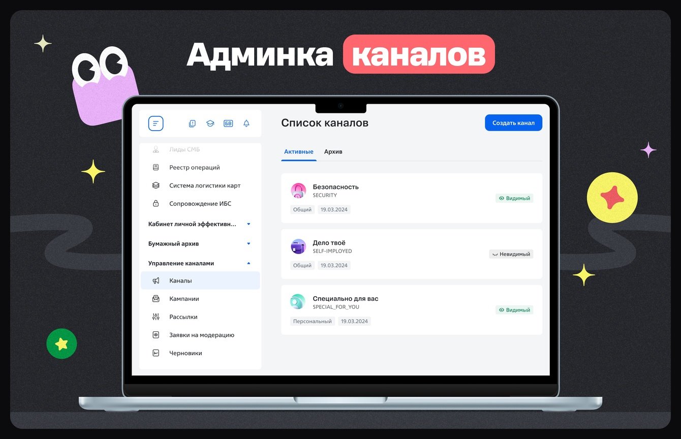 Персональные каналы — формируются с учётом профиля клиента. Здесь публикуются индивидуальные предложения, напоминания и персонализированный контент. Каждое сообщение адресовано конкретному клиенту.