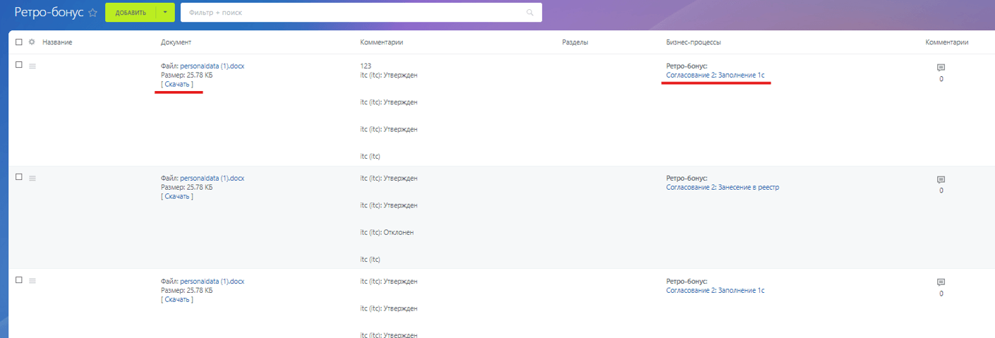 После окончания согласования можно скачать согласованный документ или просмотреть бизнес-процесс с комментариями согласующих.