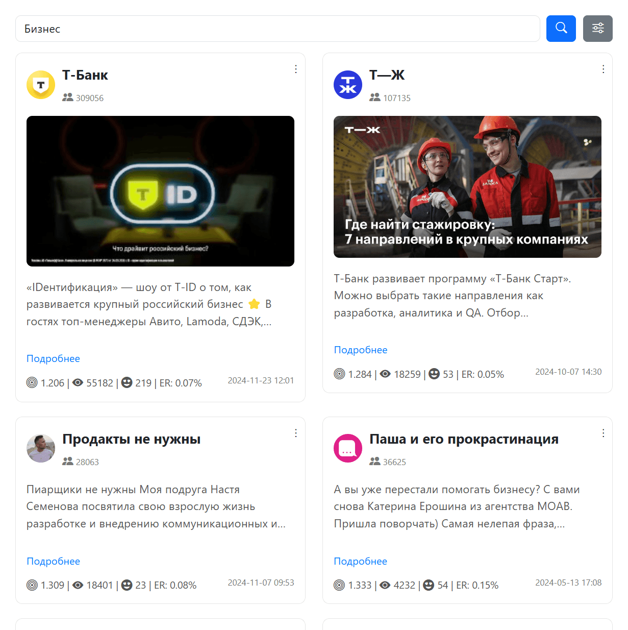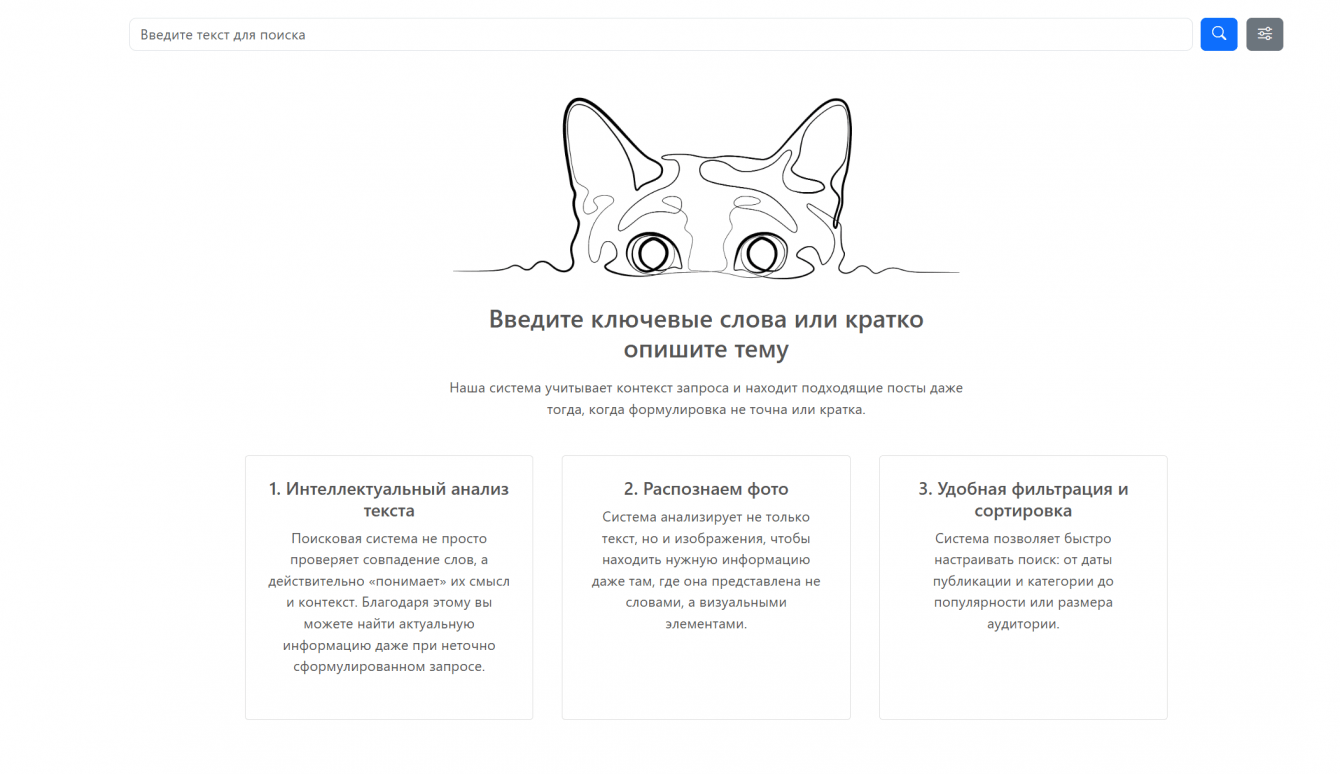 Модуль поиска и рекомендации: Мультимодальный поиск, позволяющий находить релевантные каналы и посты даже по нечеткому описанию.