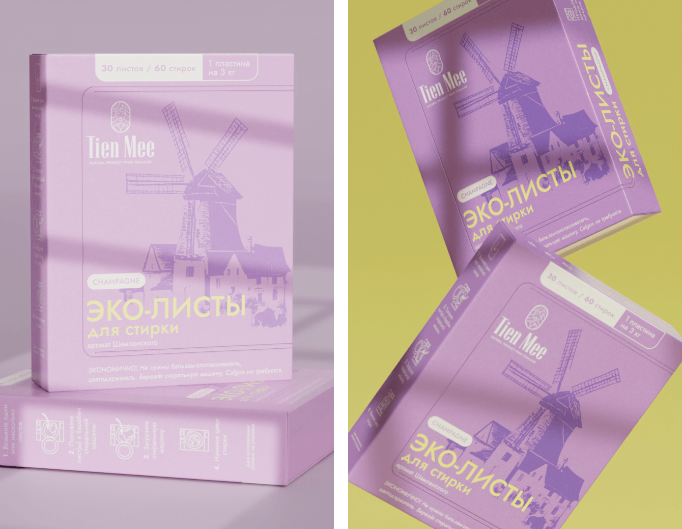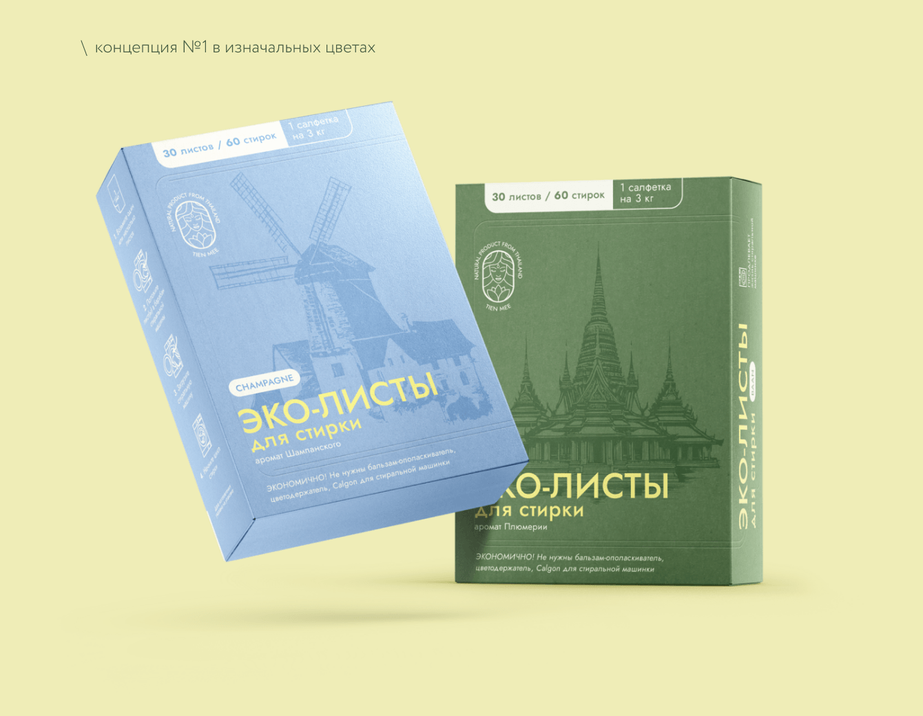 Данная концепция вдохновлена культурой регионов, ароматы которых обозначены на упаковках. «Почувствуй Тай у себя дома» и «Почувствую Шампань у себя дома» — лейтмотивы первой концепции. На упаковке с эко-листов с ароматом шампанского изображена мельница посреди виноградной плантации, а на упаковке с ароматом плюмерии — храмовая архитектура Таиланда. Палитра вдохновлена географией (фиолетовый цвет ассоциируется с лавандовыми полями Франции, зеленый напоминает о#nbsp;природе Таиланда), но также символизирует чистоту, натуральность, экологичность.
