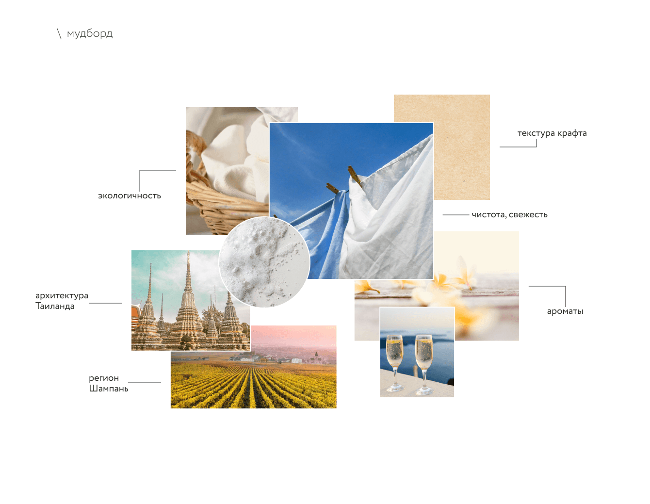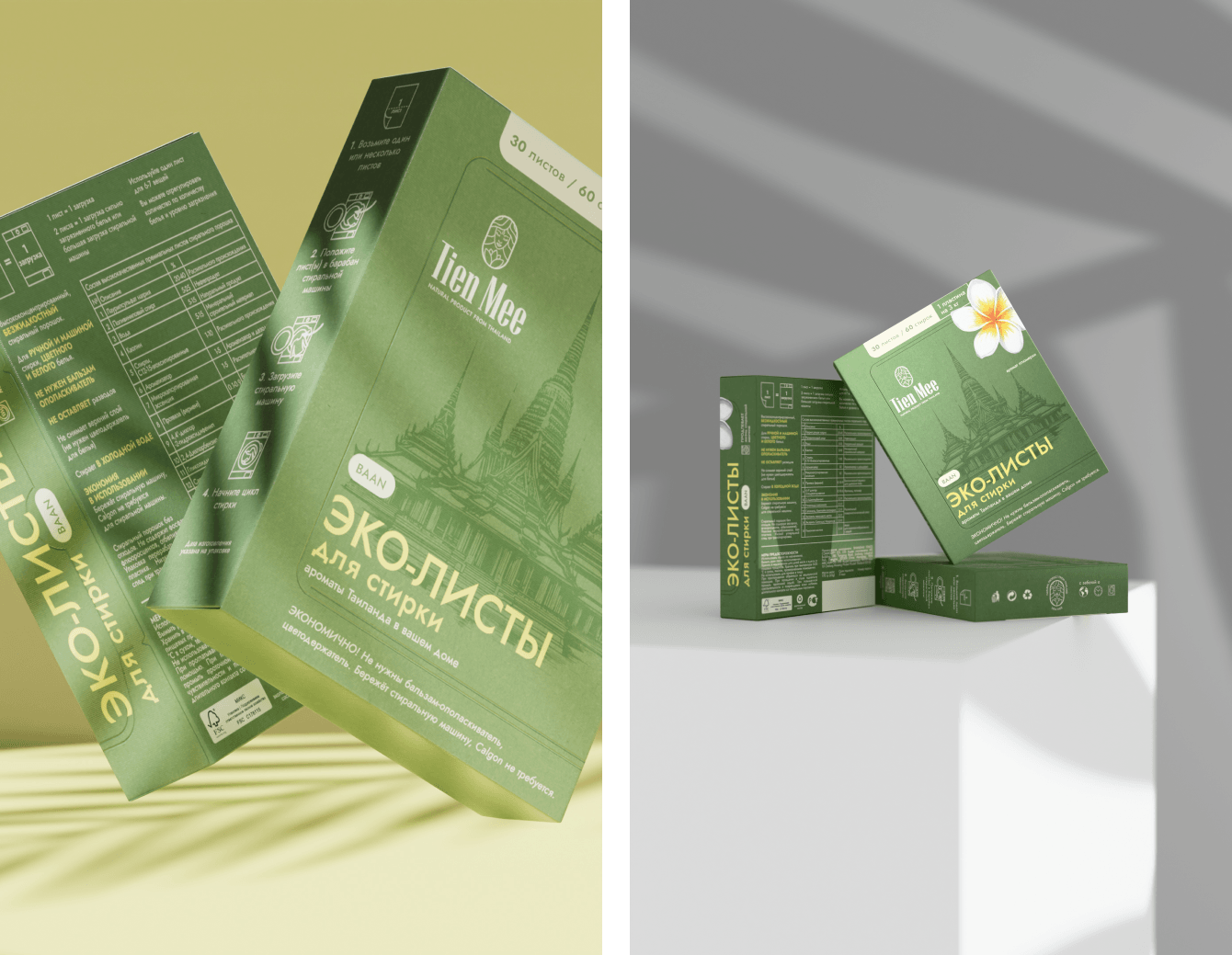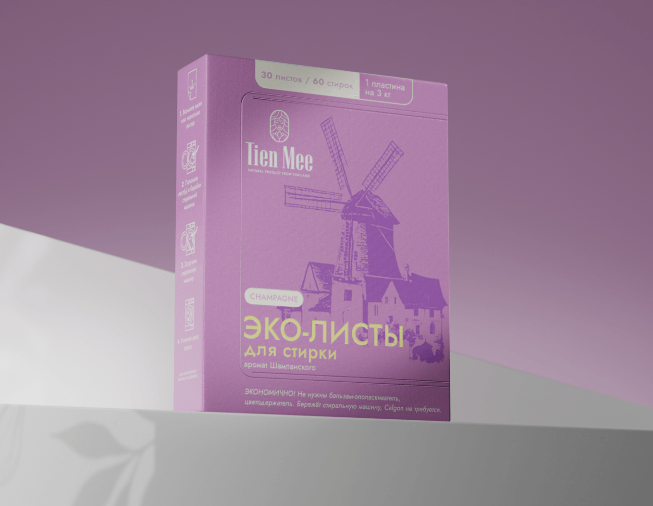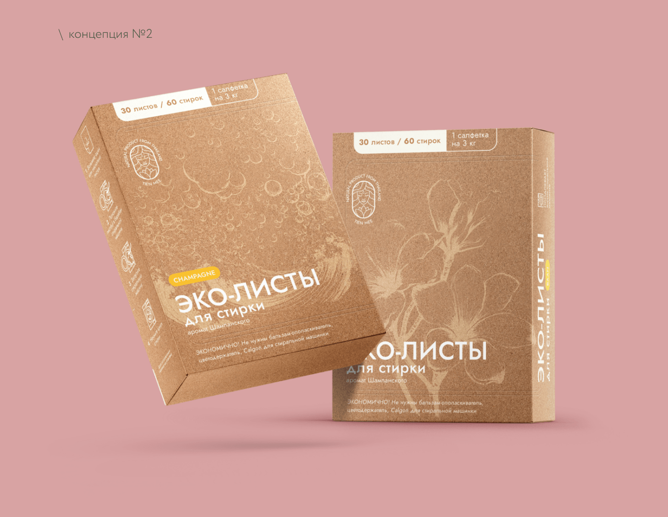 Для разработки упаковки эко-листов для стирки мы сконцентрировались на идеях чистоты, экологичности, натуральности и эстетичности. В качестве основных ассоциаций были взяты элементы, связанные с ароматическими свойствами листов. Это ассоциации не первого порядка, но вкупе с палитрой, грамотной версткой и текстурой, продукт вписывается в конкурентное поле, но выделяется на фоне пёстрых и ярких упаковок конкурентов.