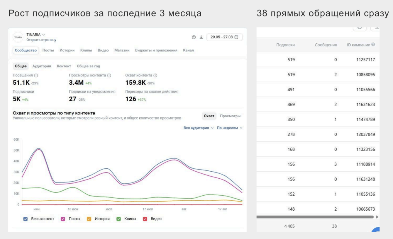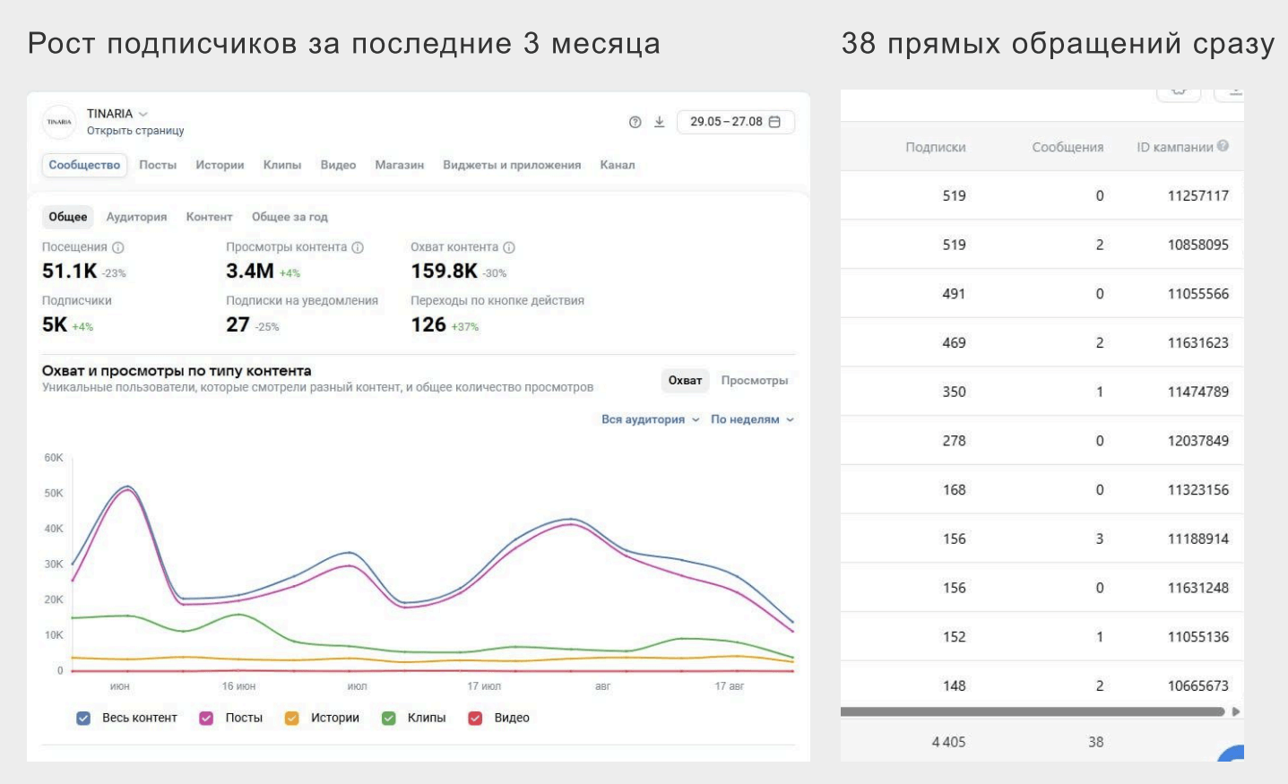 TINARIA — пример того, как для масс-маркета с ограниченным бюджетом можно выстроить прибыльную систему продаж через воронку внутри ВКонтакте: подписка дешевле, чем прямая реклама, регулярный прогрев через контент и рассылку, продажи строятся на долгом цикле клиента.