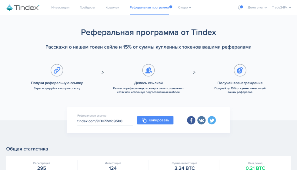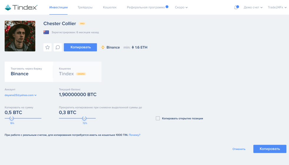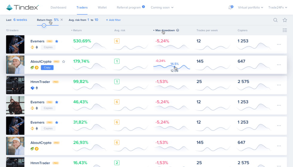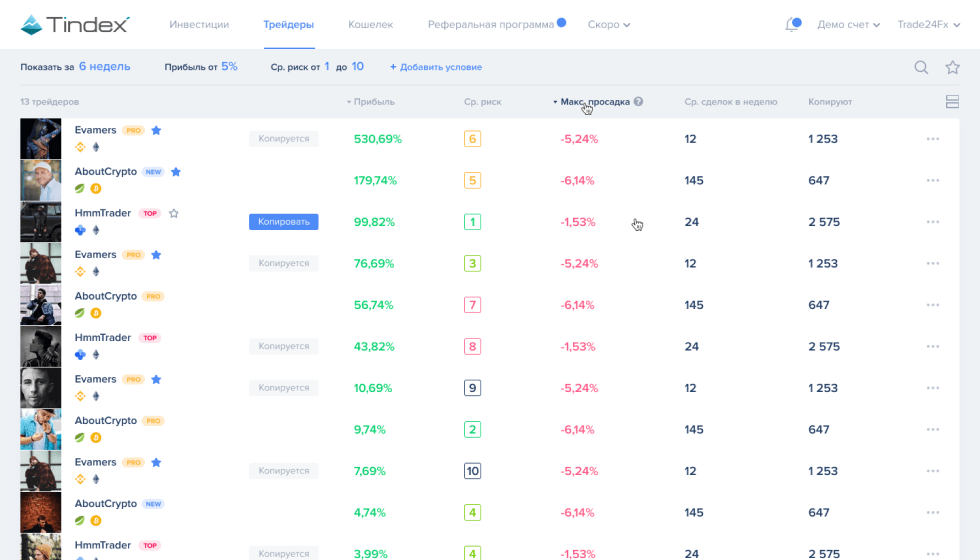 Копитрейдинговая платформа "под ключ". Разработано: Концепция, проектирование, дизайн, верстка. Tindex, позволяет удобно находить и анализировать трейдеров, повторять их торговлю в автоматическом режиме.
