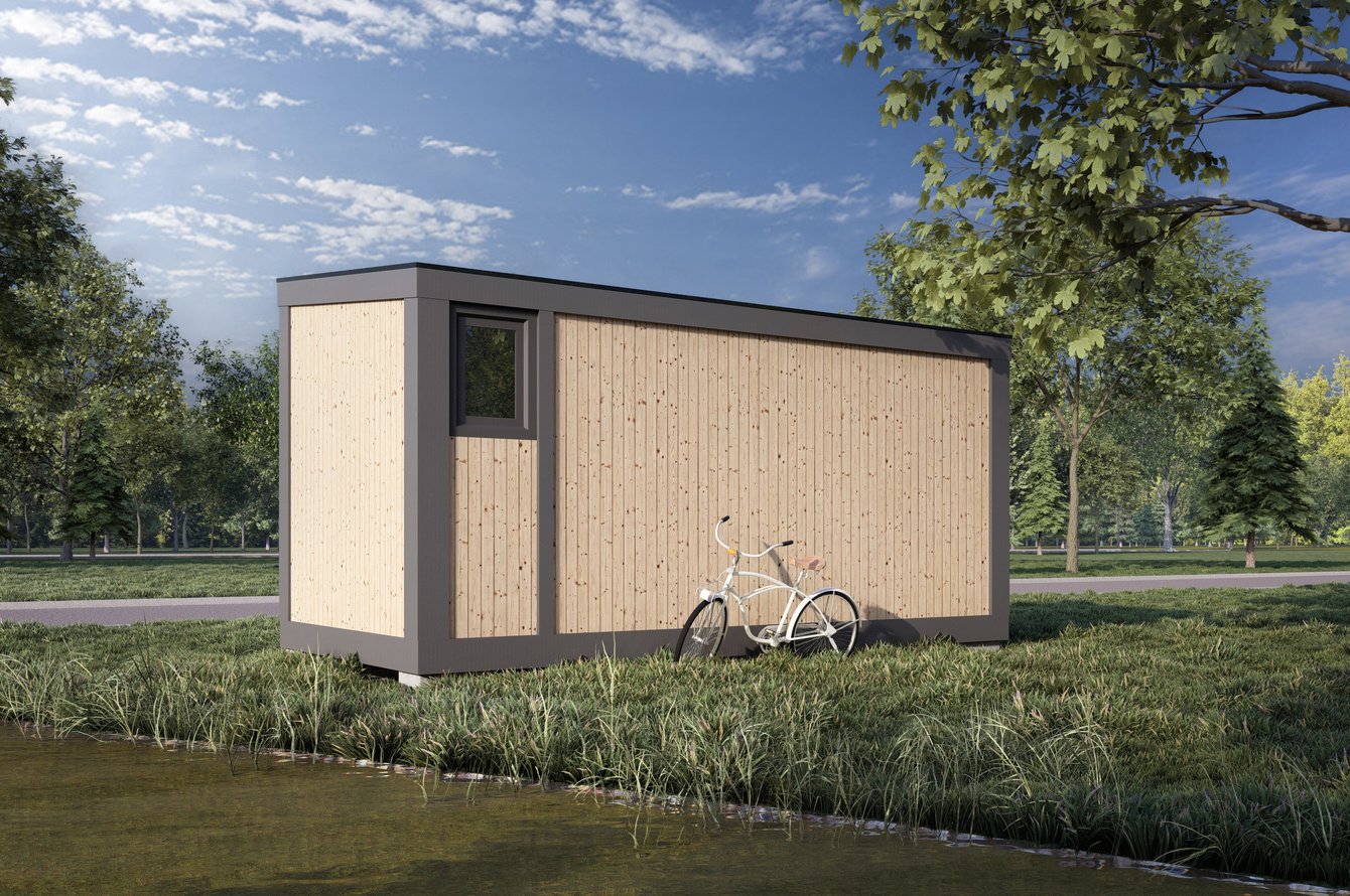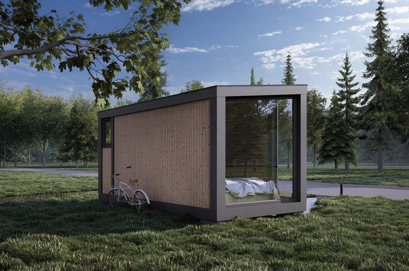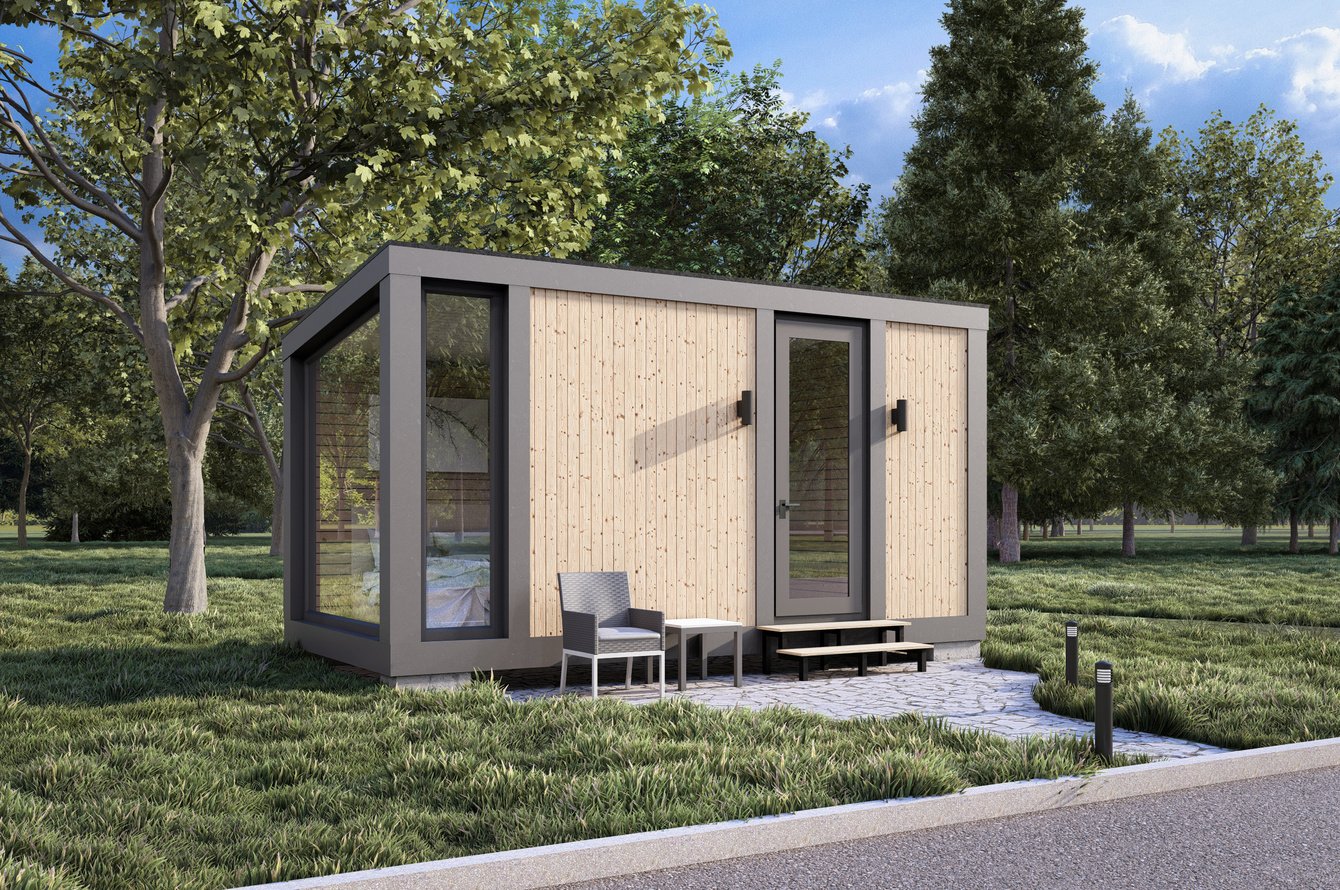 Разработана стильная визуализация компактного гостевого домика площадью 15 кв.м в современном скандинавско-экологичном стиле.