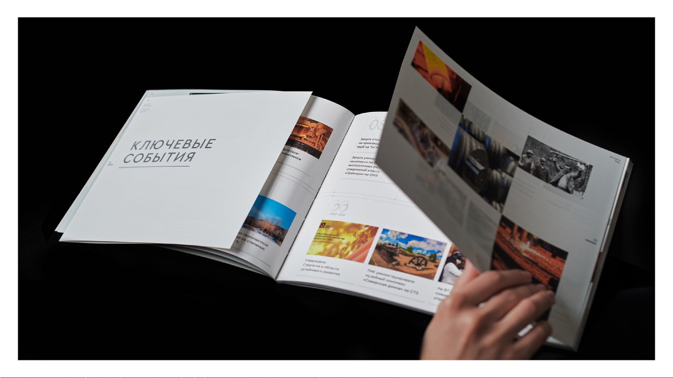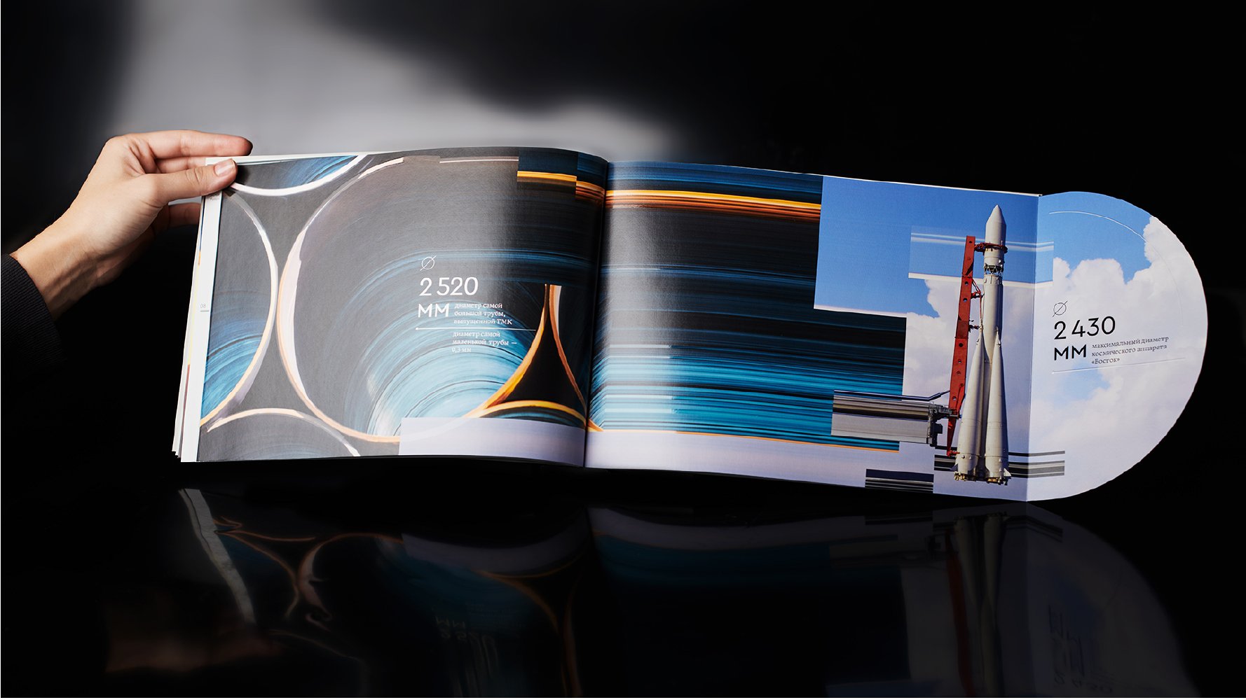 Для усиления эффекта факты и сопоставления напечатаны на раскладывающихся клапанах, своей формой напоминающих трубы. Другой важный стилеобразующий элемент дизайна — эффект горизонтального растяжения изображений, который подчеркивает протяженность истории ТМК, отражает стремительный темп прогресса компании, а также иллюстрирует процесс производства труб в трубопрокатном цеху.