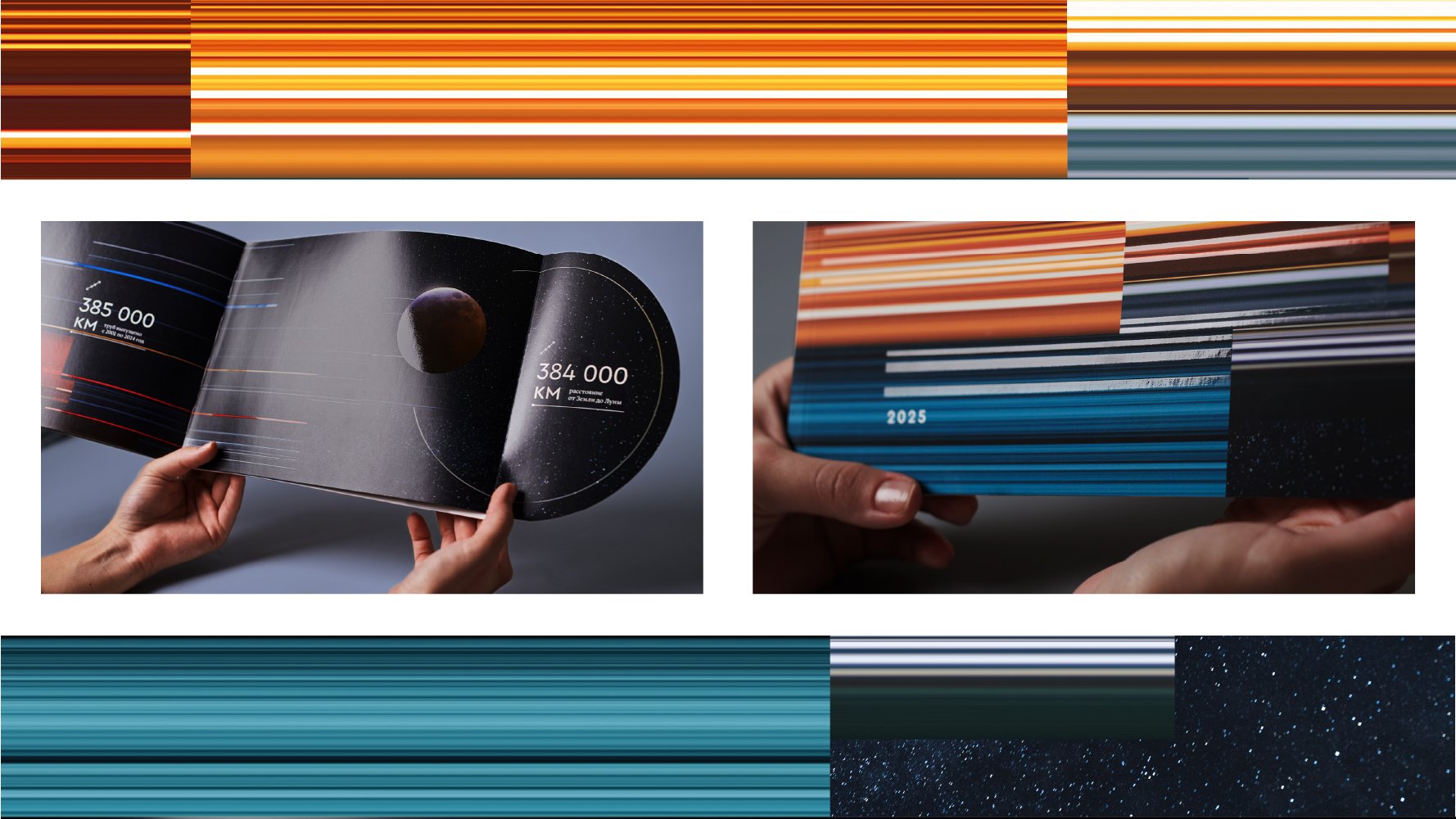Концептуальная идея воплощена с помощью наглядных сравнений и сопоставлений, эталоном для которых служит, собственно, космос — собирательный образ будущего, технологий и развития. Ключевые факты и цифры достижений представлены в сравнении с космическими объектами — их размерами, расстояниями, массами и т.д. В результате вырисовывается впечатляющая картина прогресса и достижений компании за всю историю её деятельности.