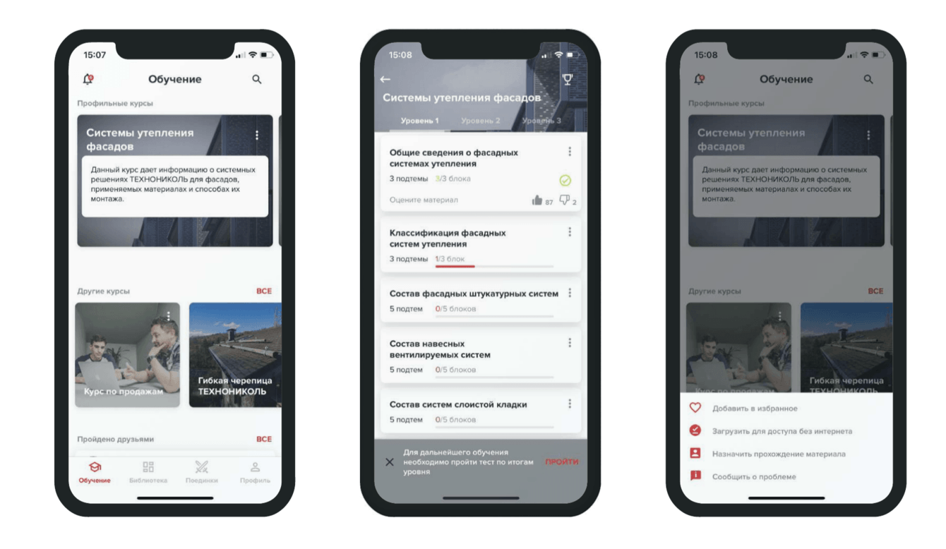 На базе существующей корпоративной методологии обучения и печатных учебных материалов было реализовано мобильное приложение, включающее следующий функционал с системой проверки знаний:
