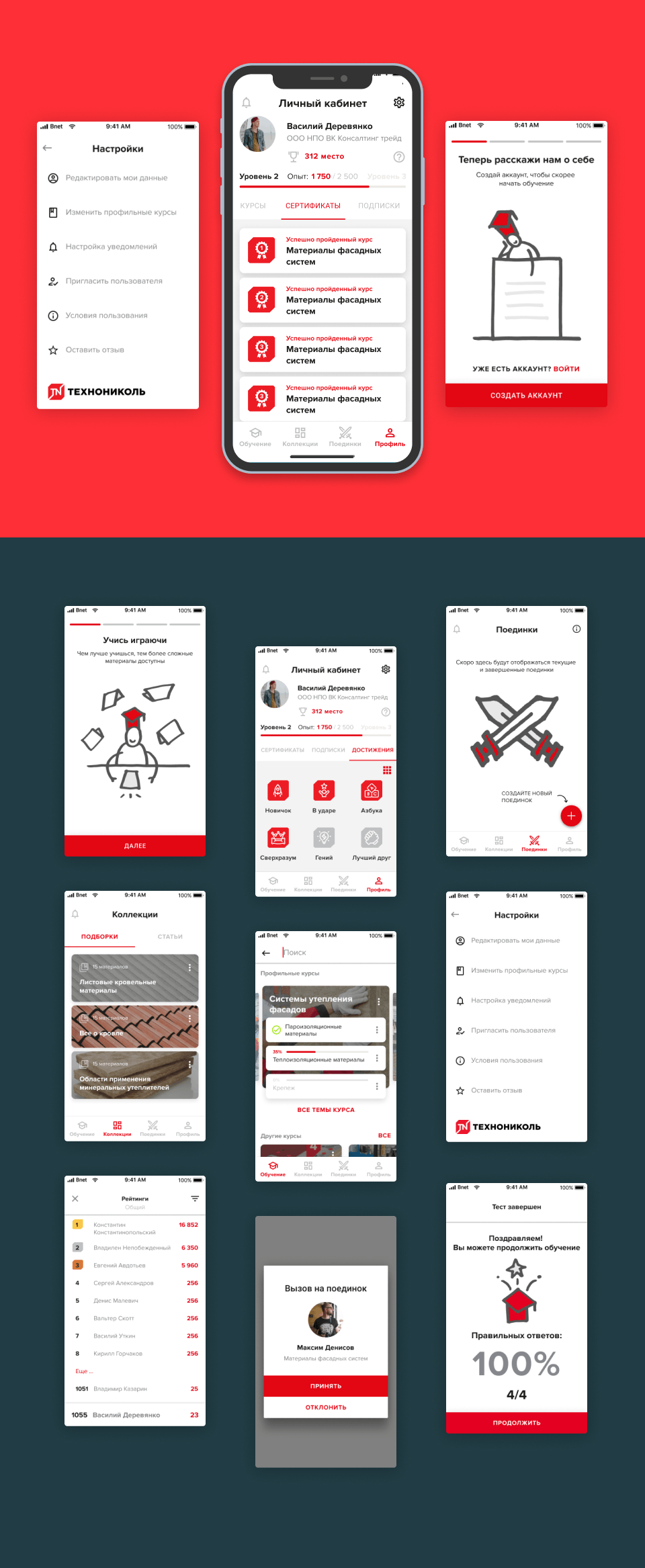 При реализации проекта мы рассмотрели наиболее успешные кейсы мобильного обучения (открытого и корпоративного) и постарались совместить существующий опыт на рынке со спецификой клиента. Большой разброс по аудитории определил выбор наиболее распространенных навигационных и информационных моделей - тех, которые пользователь уже встречал в других мобильных приложениях и которые не вызовут у него дополнительных вопросов.