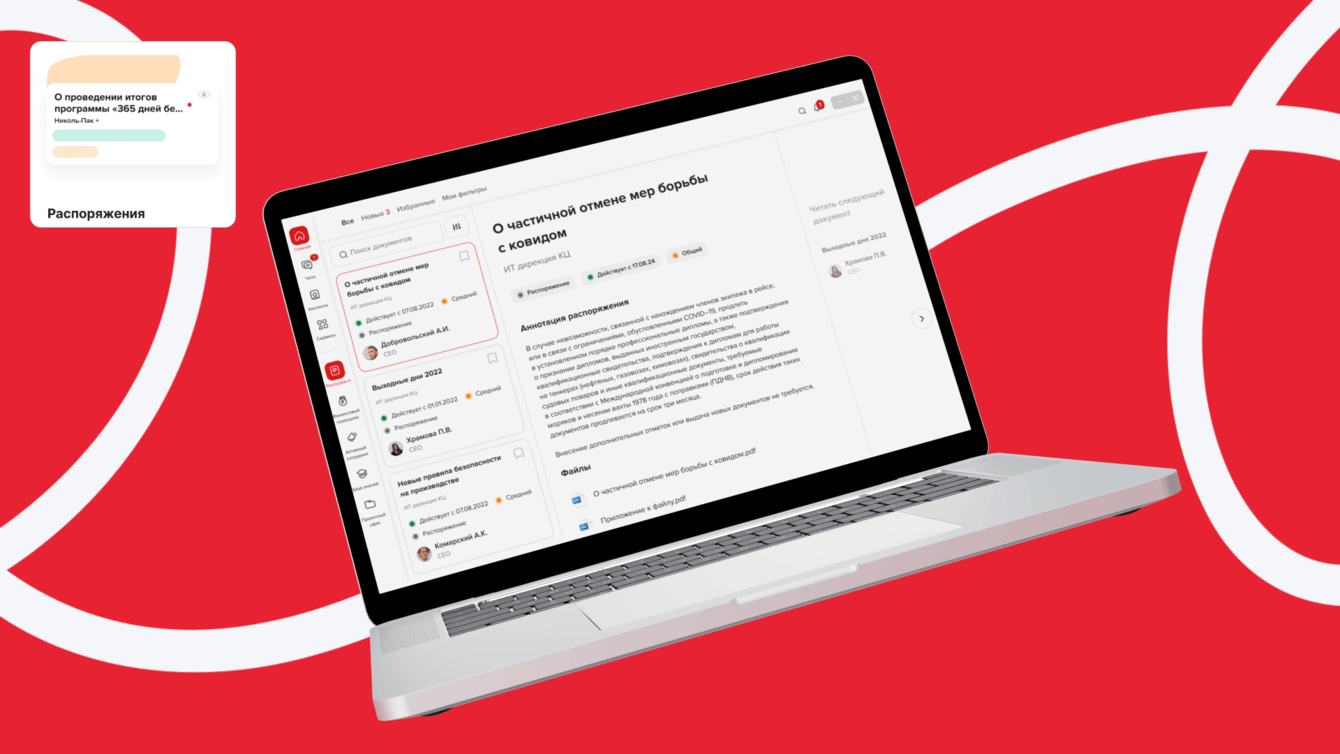 Сервис, в который добавляют распоряжения и информационные письма, подписанные генеральным директором, акционерами или руководителями подразделений. Сотрудники могут ознакамливаться с этими текстами, подписываться на интересные разделы и сортировать распоряжения по типу, руководителю, периоду или подразделению