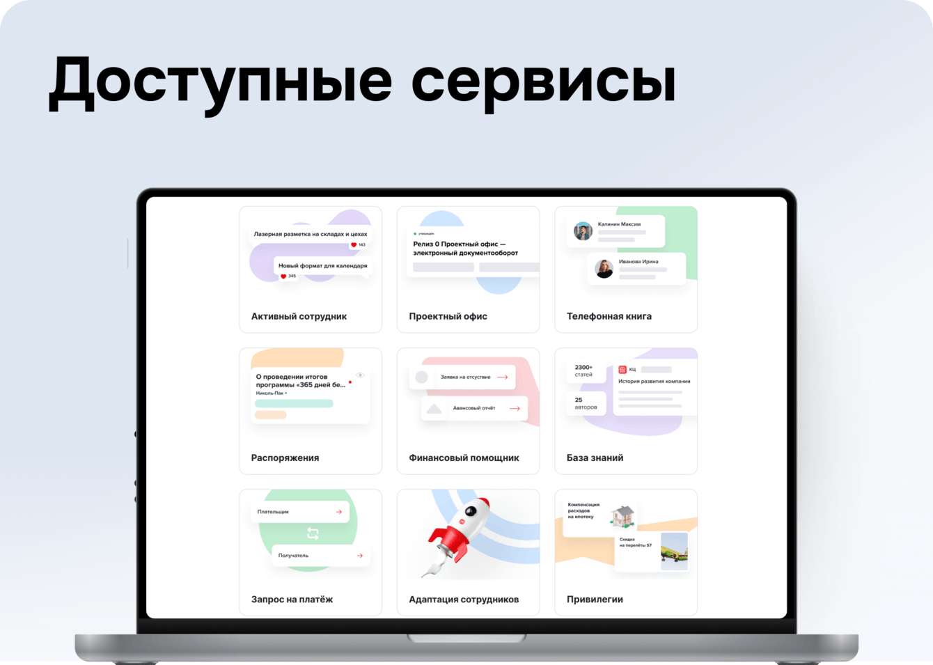 На главной сотрудникам рассказывают о функционале экосистемы и знакомят с основными сервисами.