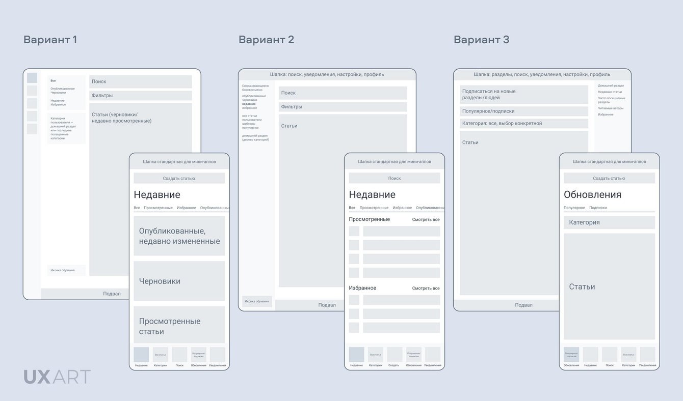 Начали с опроса пользователей, для этого подготовили 3 варианта мета-прототипов с разным составом и расположением блоков на основе существующих трендов и исходных данных.
