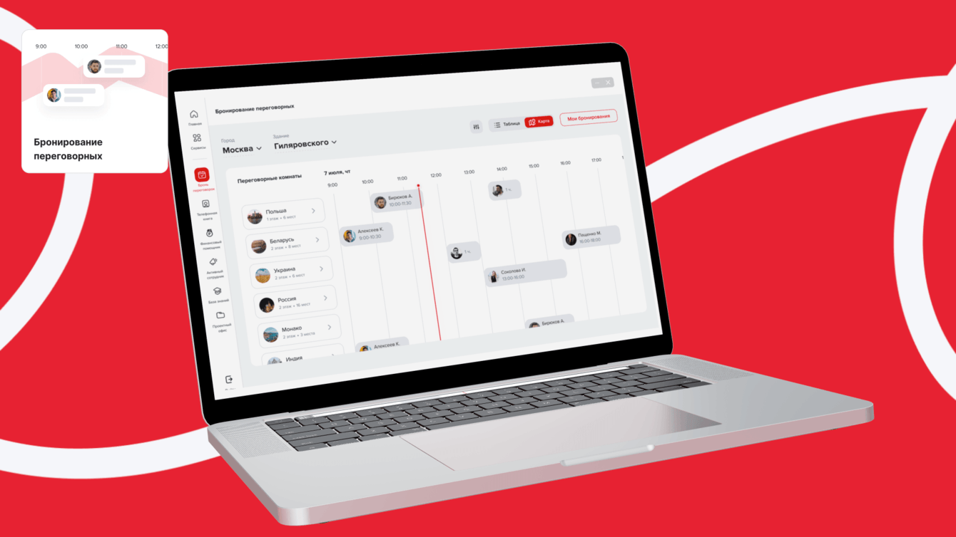 Сервис, через который вы можете подобрать и забронировать переговорную комнату в офисах ТЕХНОНИКОЛЬ. Сотрудники могут найти и забронировать переговорную комнату, а также пригласить внешних участников.