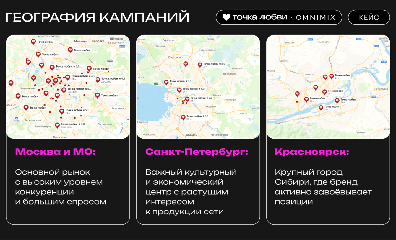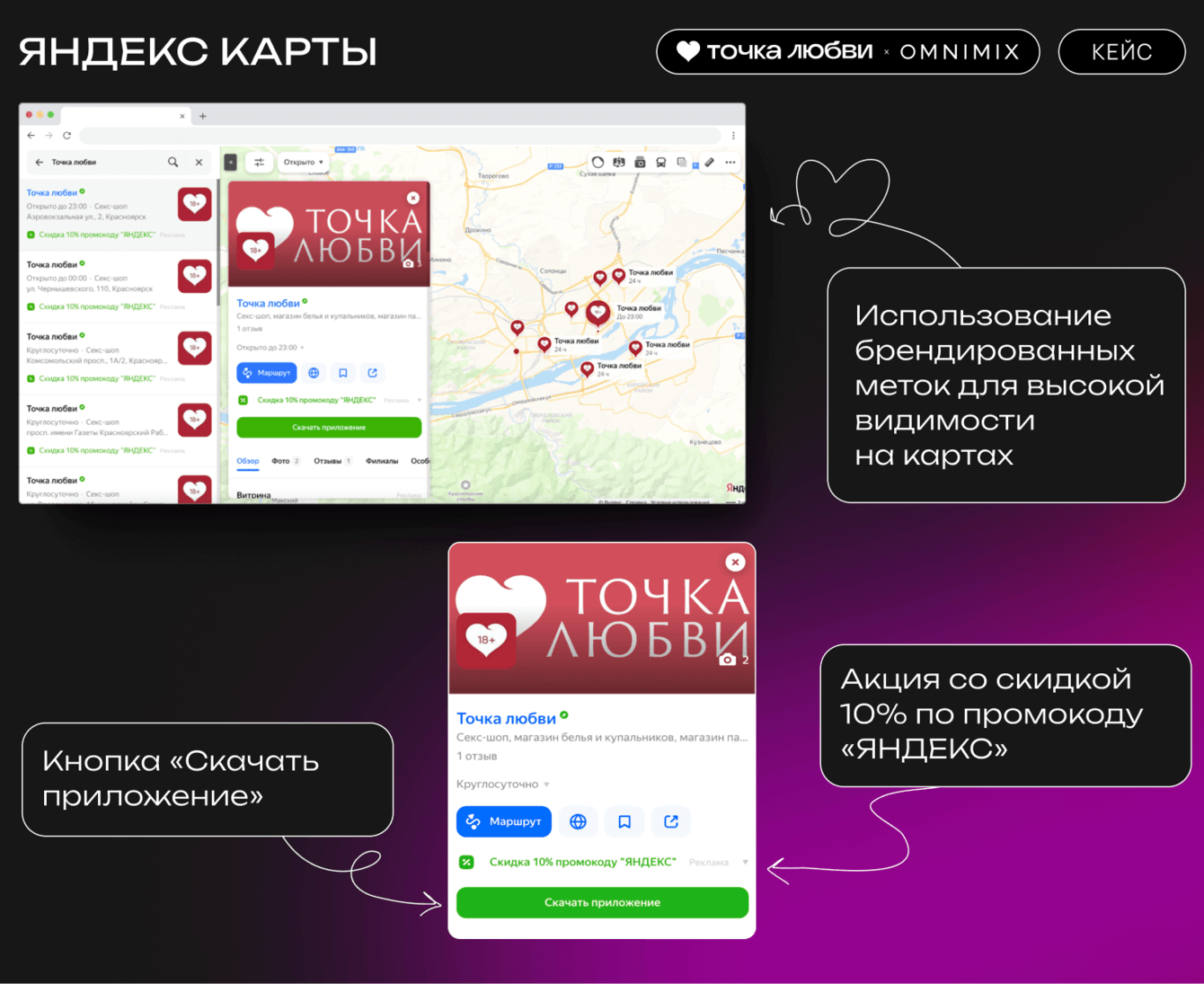 В индустрии товаров для взрослых, где возможности продвижения ограничены, найти по-настоящему эффективные инструменты — непростая задача. Привычные маркетинговые подходы часто не дают желаемых результатов, и компаниям, таким как «Точка Любви», приходится искать новые способы привлечения аудитории и укрепления бренда. В агентстве OMNIMIX мы не боимся браться за сложные проекты, видя в этом интересный челлендж и возможность доказать свою экспертизу. Несмотря на все трудности, «Точка Любви» смогла добиться впечатляющих результатов, применяя формат «Брендированный приоритет + POI» на Яндекс Картах. В этом кейсе мы покажем, как этот инструмент помог сети привлечь внимание к филиалам и доказал свою эффективность в специфической нише.
