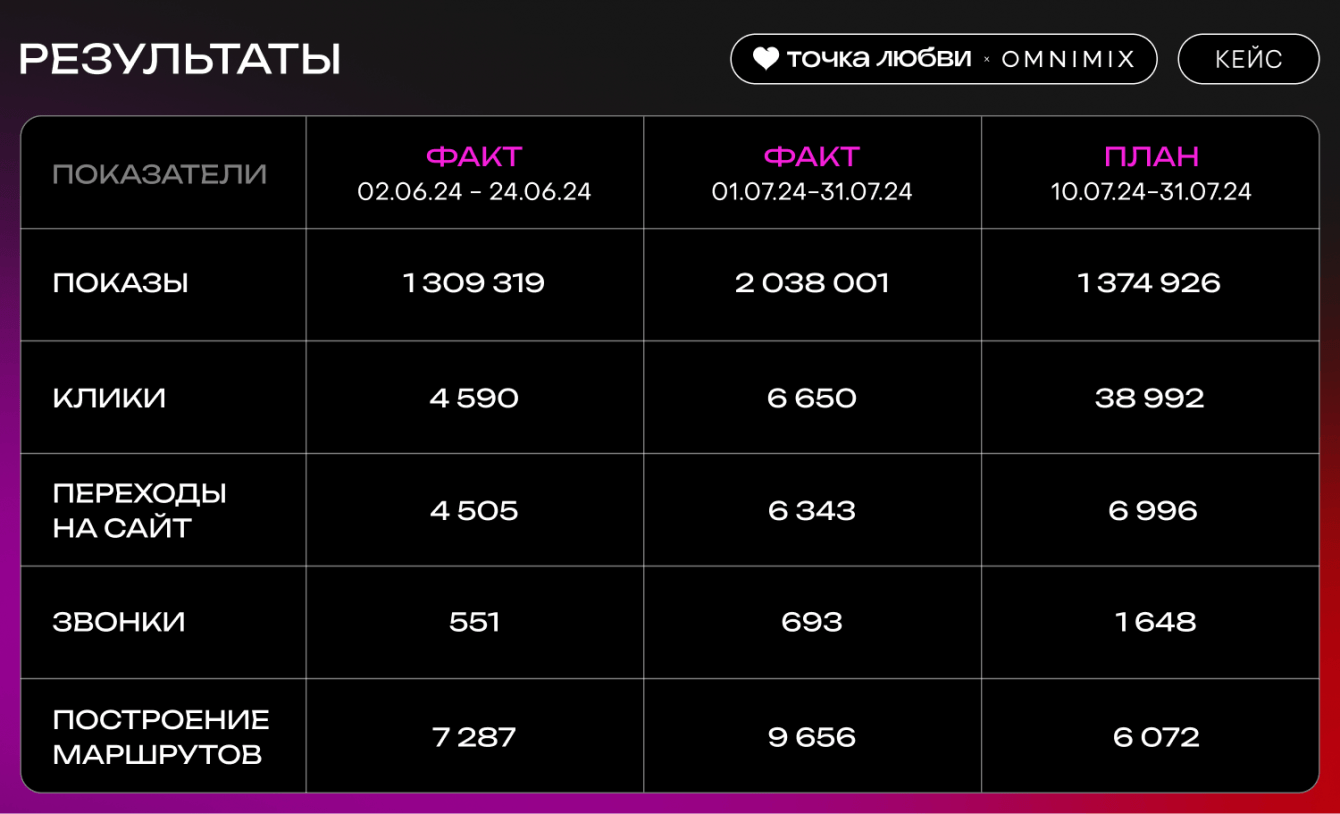 Рекламная кампания для сети «Точка Любви» на Яндекс Картах, реализованная агентством OMNIMIX, продемонстрировала положительную динамику и успешность выбранной стратегии. Формат «Брендированный приоритет + POI» обеспечил высокий уровень видимости, вовлеченности и конверсии, что привело к значительным успехам в развитии бренда.